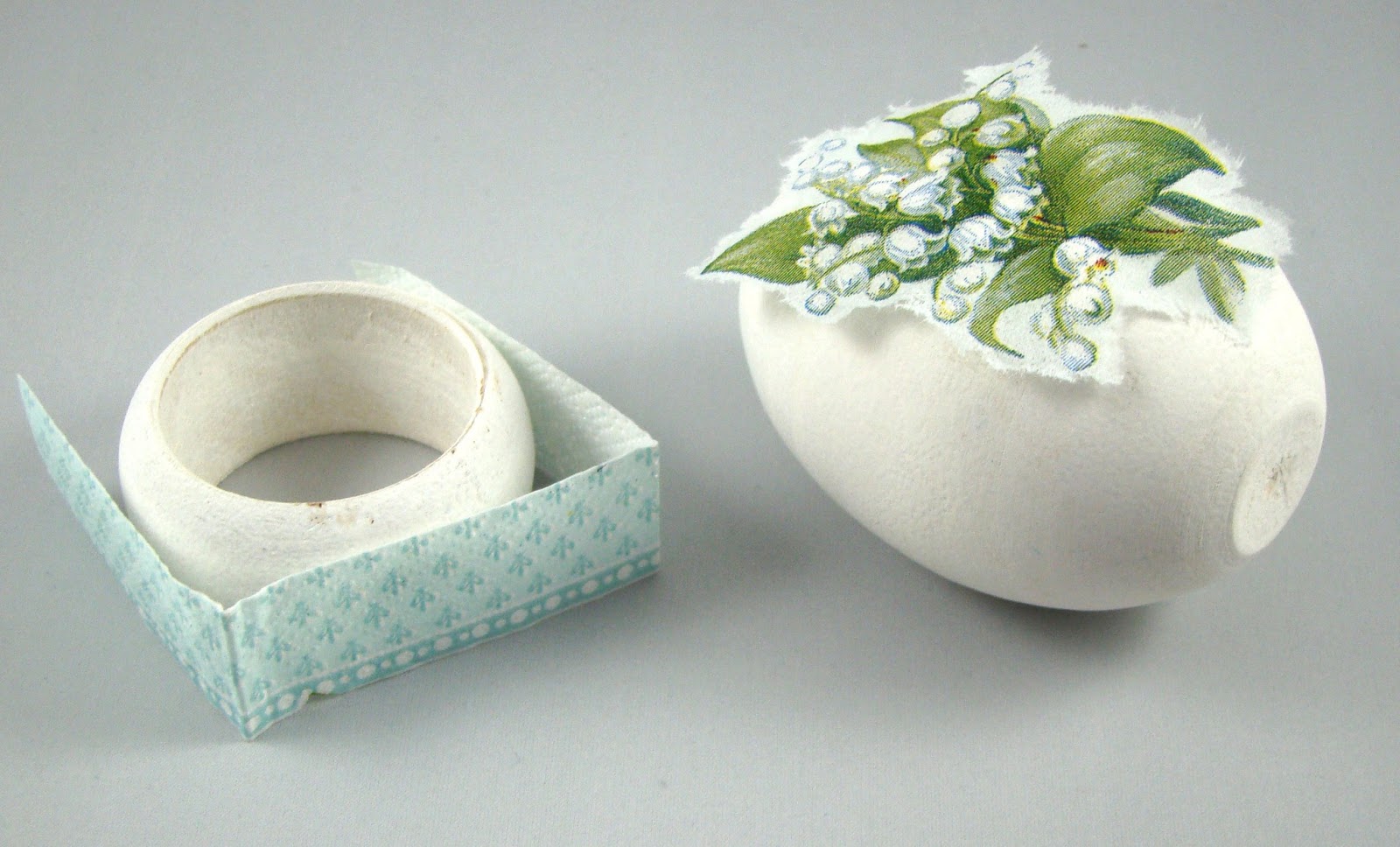2. Оно будет на подставке. В качестве подставки я использую кольцо для салфеток. Тоже деревянное. Вырвала из салфетки фрагмент с букетом ландышей и вот такую полоску.