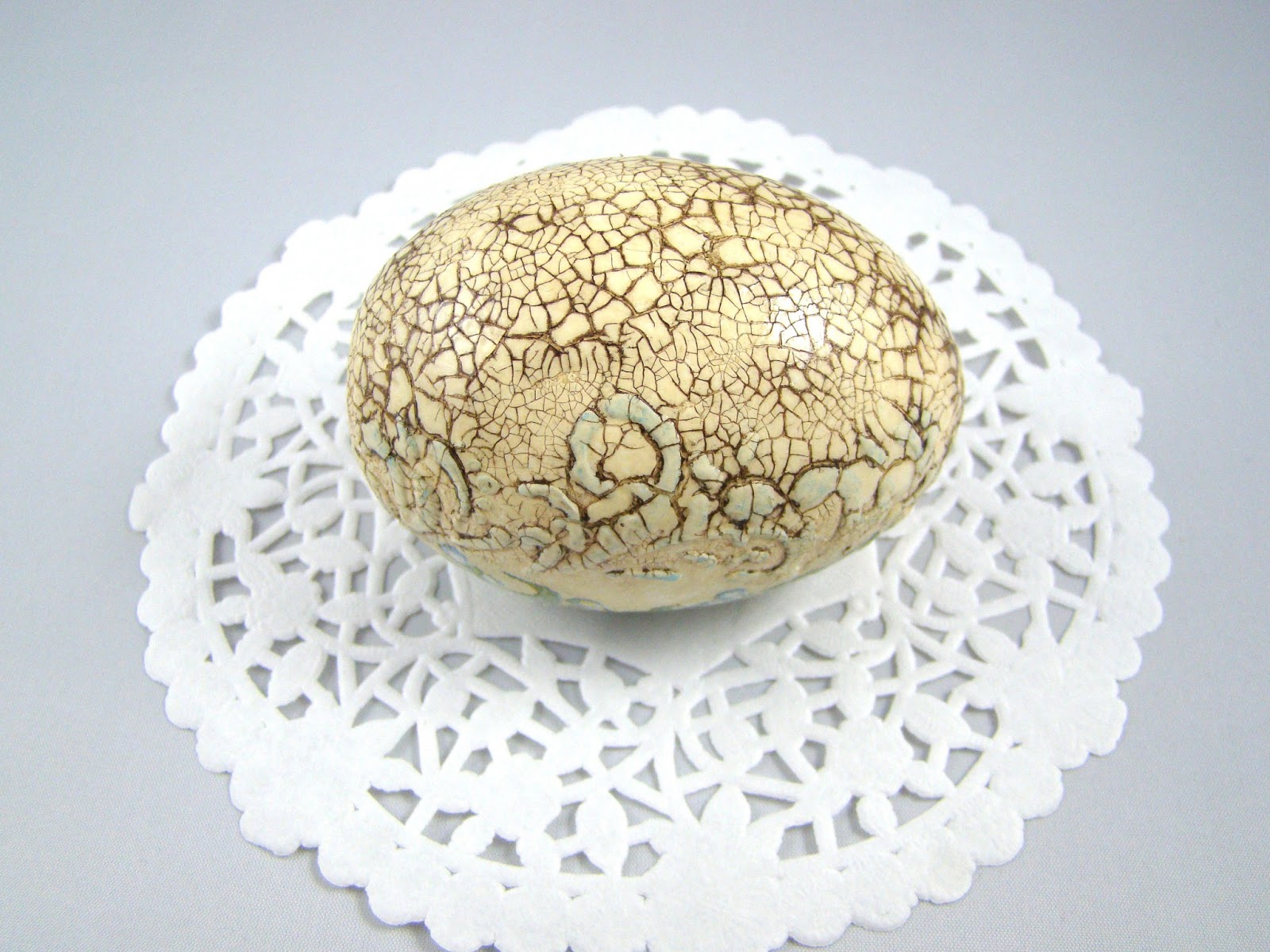 8. Для тех, кто, как и я хочет соблазниться и сделать "старое" яйцо, с возрастом, и намазать его умброй жженой.:) Знайте, получается вот такая .ака!) Если получили то, что вам не понравилось, берем в руки жесткую губку и нещадно смываем. Лак кракелюрный отходит не сразу, но поддается. Вот здесь картинку придержит лак.