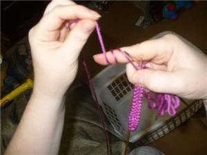 Сначала просунить правую спицу в петлю, затем сделать обмотку на палец и протащить эту обмотку СКВОЗЬ петлю. А дальше точно так же вытянуть бахрому. Все те же этапы только ЧЕРЕЗ петлю протягивается.