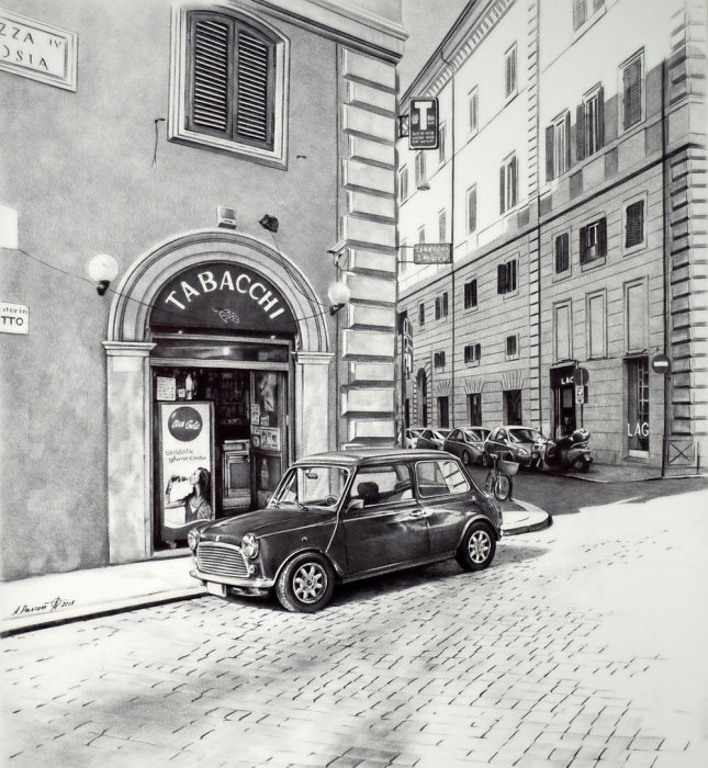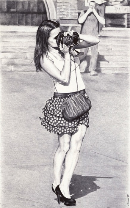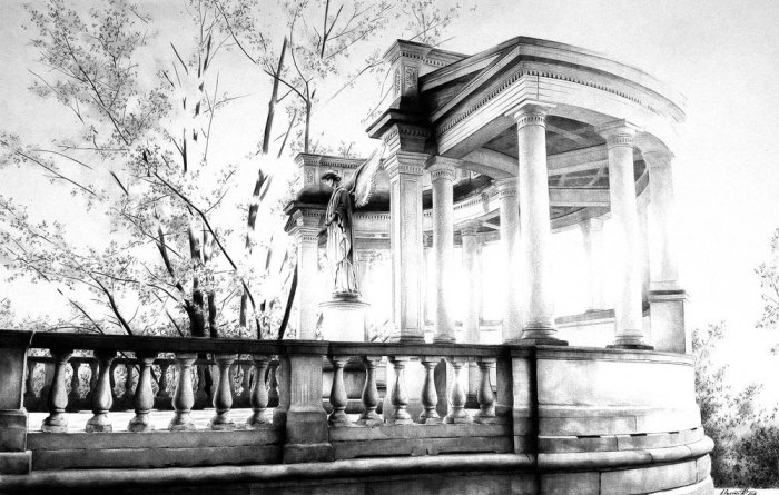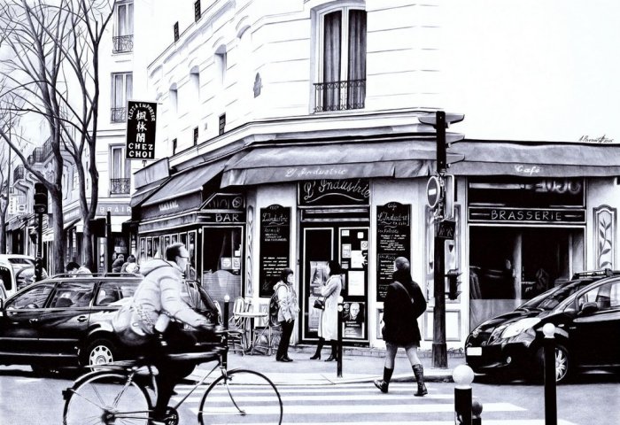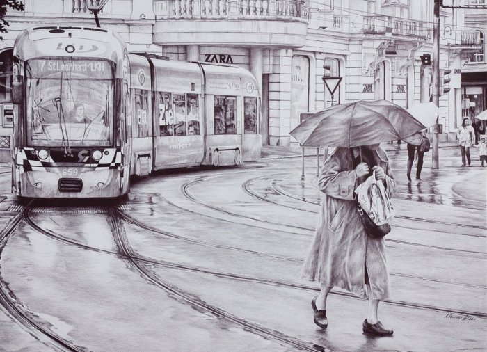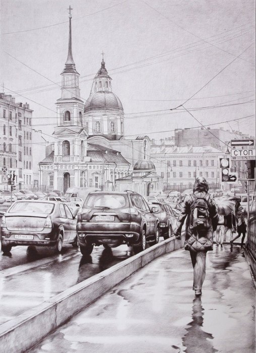 Работы Андрея напоминают монохромные снимки, и чем больше на них смотришь, тем сильнее веришь в то, что это фотография, а не рисунок, нарисованный шариковыми ручками. На создание подобного шедевра уходит энное количество времени (примерно двести – триста часов) и кропотливого труда, ведь чтобы придать каждому изображению глубину, контраст, перспективу и настроение он старательно наносит десятки чернильных слоёв, тем самым, прорисовывая и оттеняя детали. И каждый раз, возвращая взгляд к тому или иному сюжету, невольно улыбаешься, с головой погружаясь в царящую вокруг атмосферу.