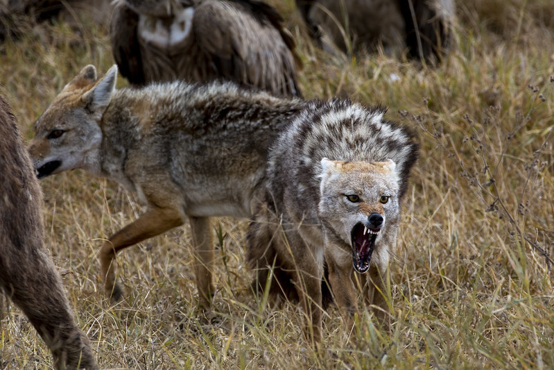 Людей эта зараза тоже избегает. Шакалы посмелее будут, особенно чепрачные. А этого гада поди найди еще! Полтора года кормила кровососов в разных нацпарках, надеясь на встречу. Всё, что мне досталось — цепочка следов на берегу Натрона! Только в мае этого года удалось впервые увидеть волчка у кромки озера в Нгоронгоро издалека. Но, конечно, снять он себя не дал. Зато раскрыл место, где его искать. В следующий заезд, уже в июне, волков как прорвало. Восемь особей за пару дней, причем все достаточно близко. Один даже к машине подошел. Удалось понаблюдать, как волчок мышкует в траве. Туристы, естественно, моего восторга не разделяли и ехали мимо в поисках «Большой пятерки».