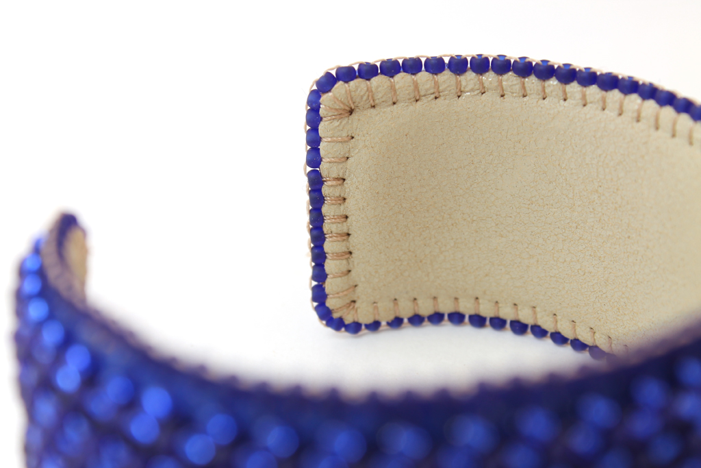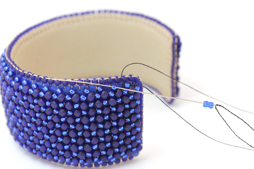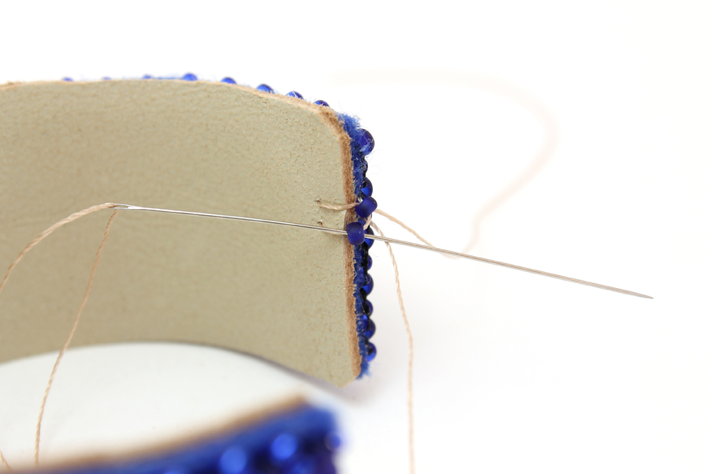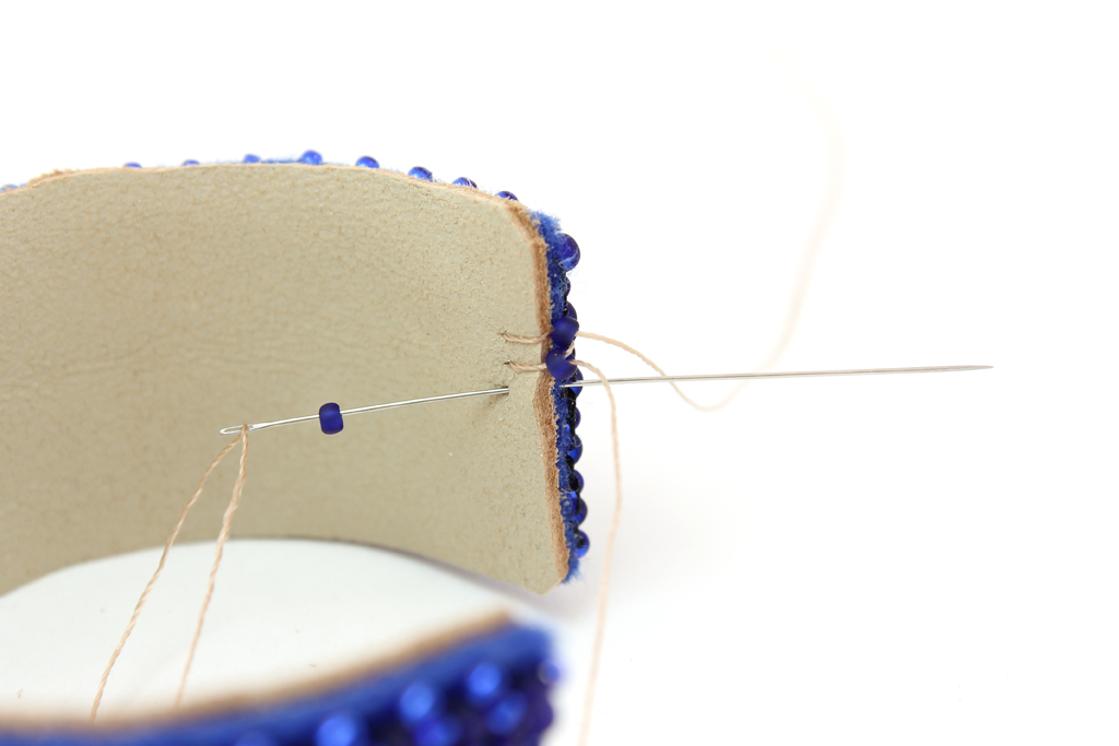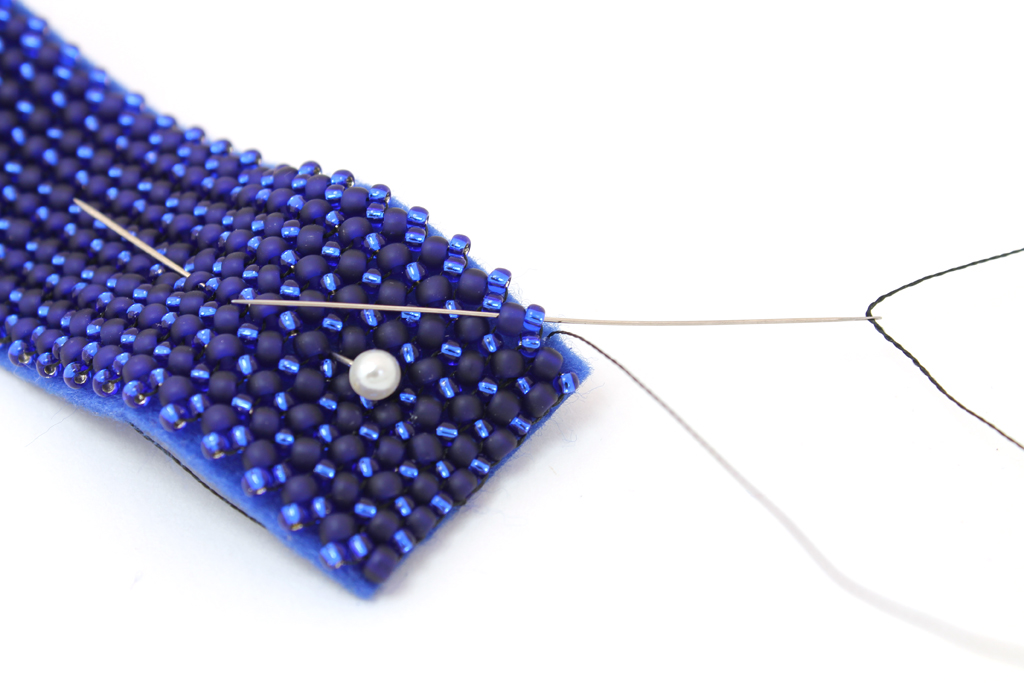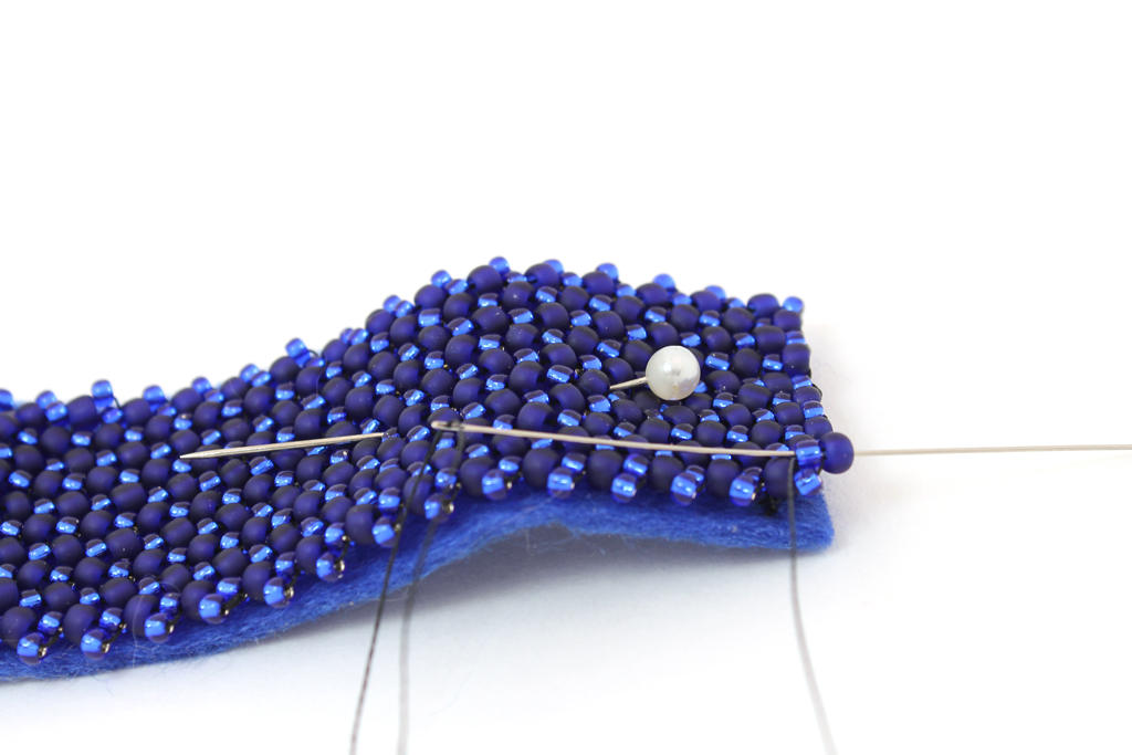 Набираем еще одну бисерину, прокалываем кожу и фетр рядом...