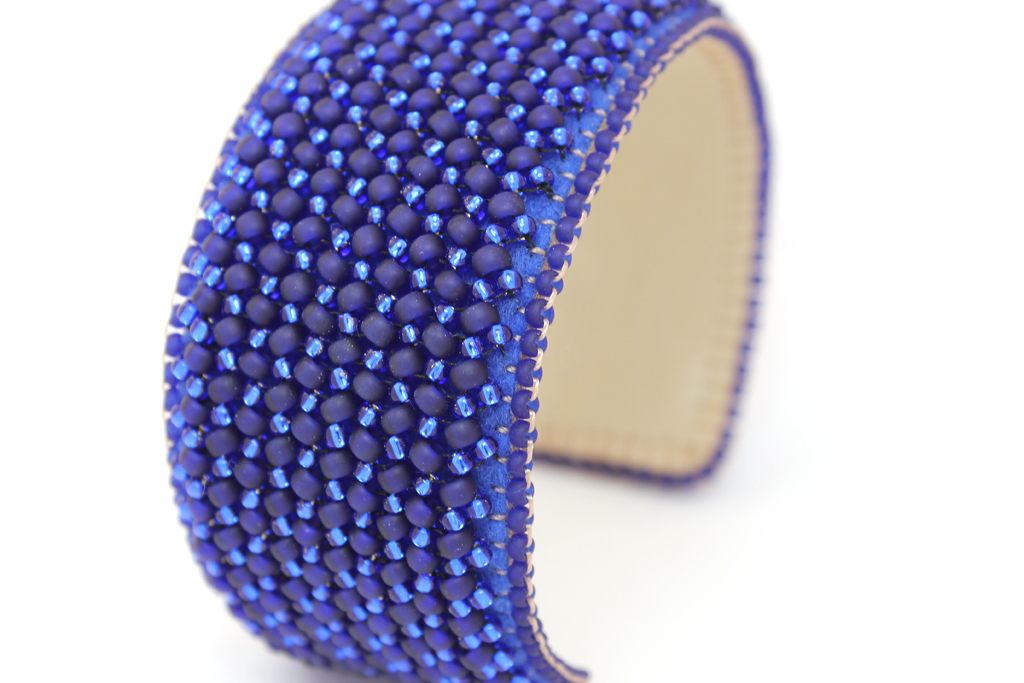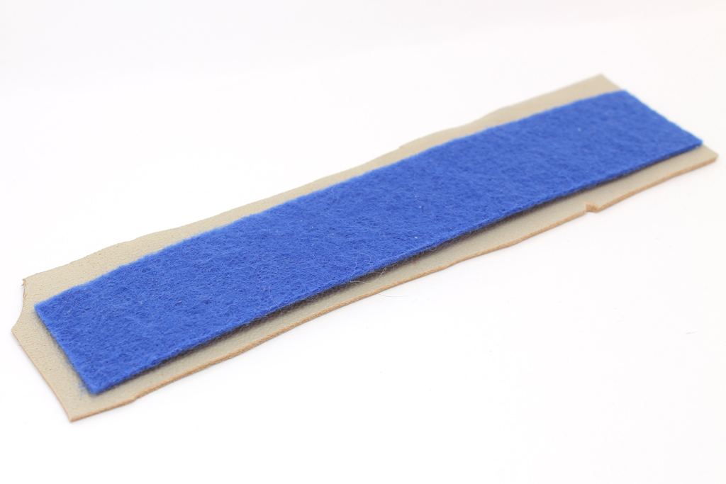 Перед тем, как закончить плетение, нам нужно хорошо все померить. Для начала вырежем из фетра прямоугольник, ширина у него должна быть такая же, как у нашего сплетенного браслета (мерить по крайним бисеринам), и при этом больше нашей металлической основы как минимум на 2 мм. Длина должна быть также как минимум на 2 мм больше, чем длина нашей основы в согнутом состоянии. Обязательно нужно мерить на согнутой основе, иначе фетр окажется значительно короче, чем нужно. Определившись с размером фетра, померим все вместе с плетеным браслетом.