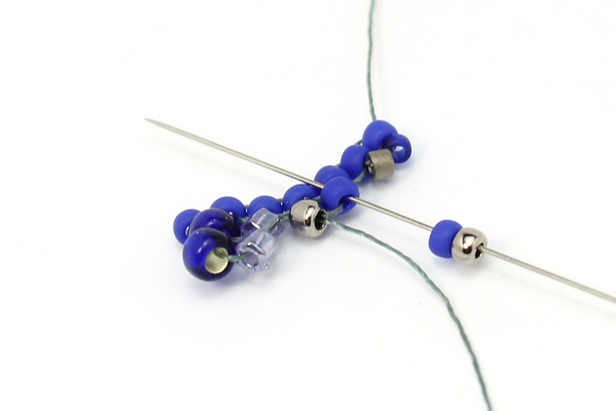 Теперь нам нужно, чтобы нить выходила из соседней бисерины, для этого проходим иглой через 3 бисерины 8/0, 3 бисерины 15/0 и через 2 бисерины 8/0 уже в обратном направлении.