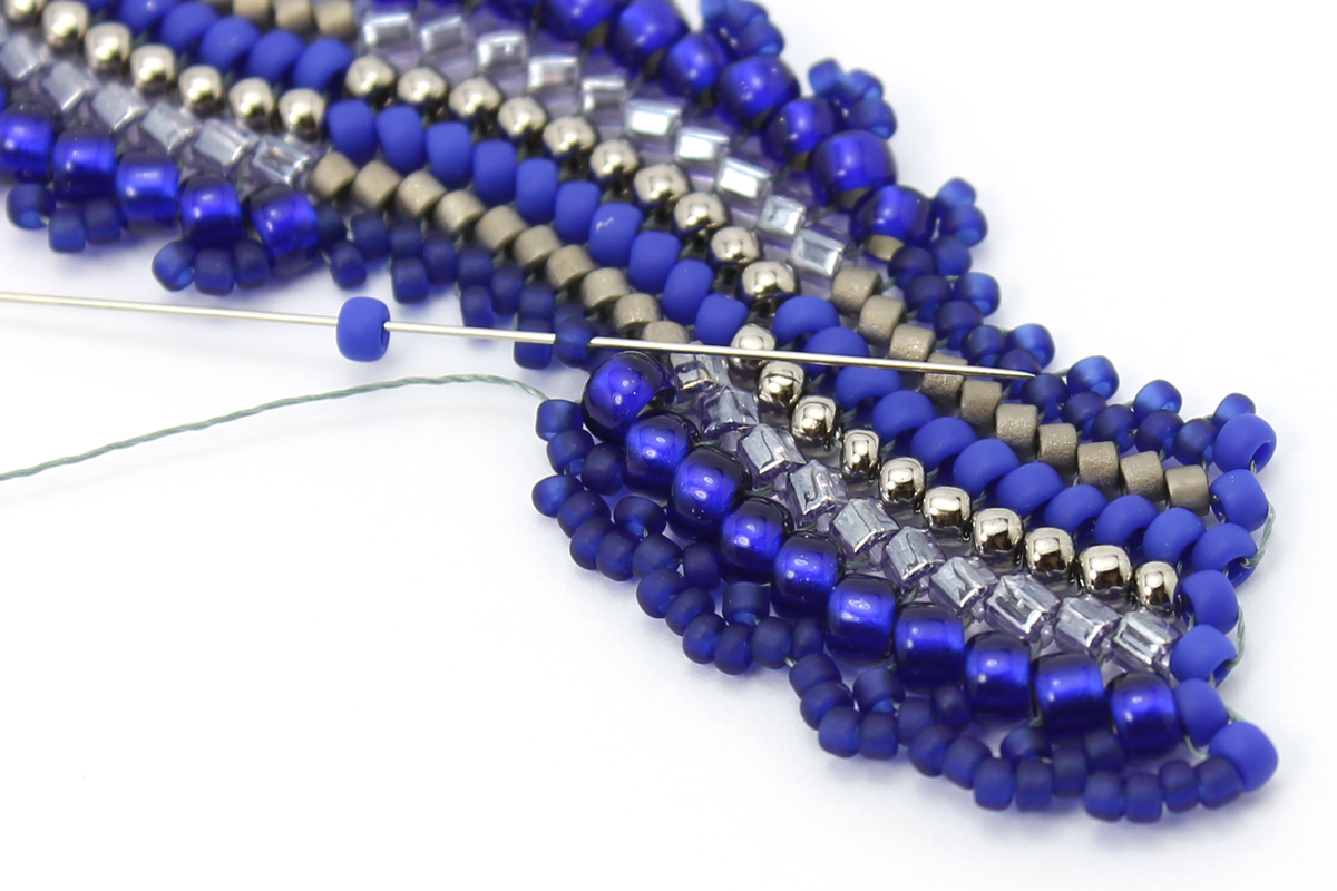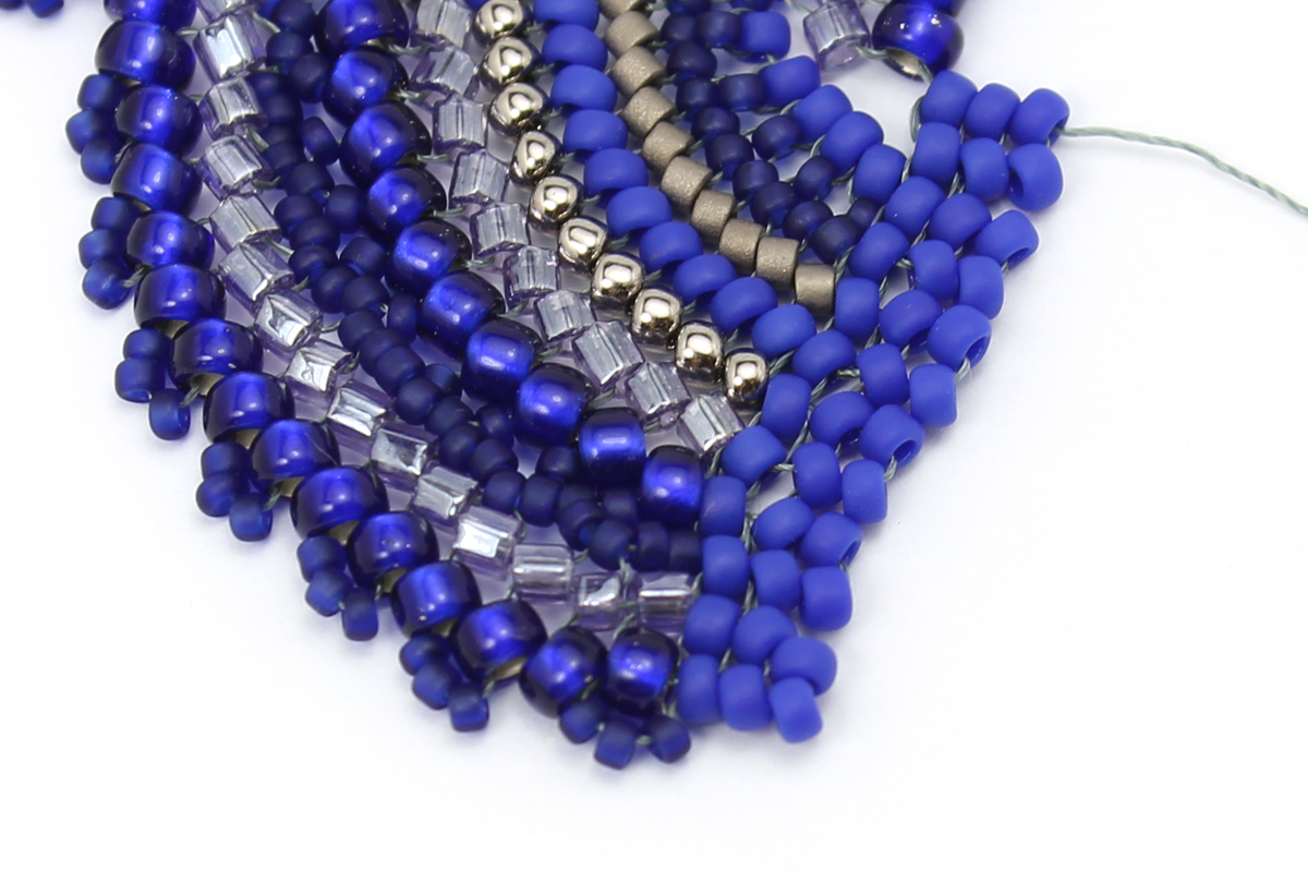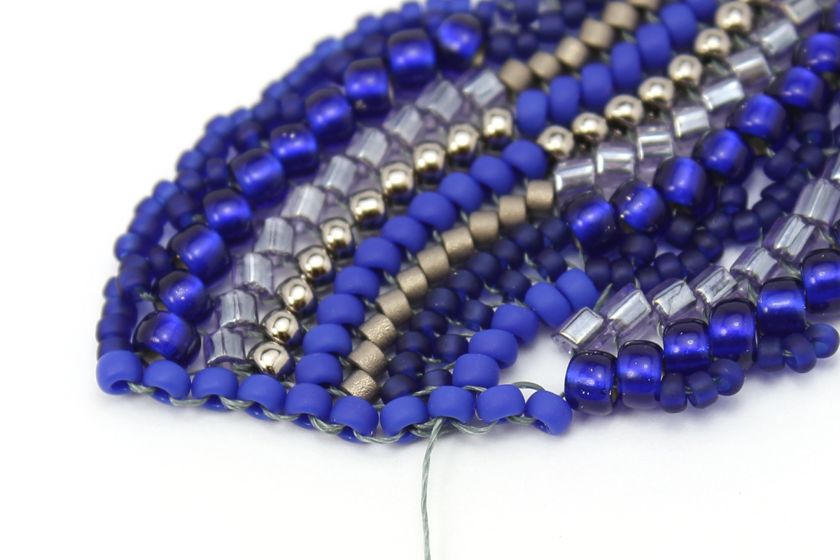Плетем еще один ряд - завершающий, с бисером 11/0 #48F. Проплетаем этот ряд в обратном направлении, чтобы закрепить бисерины.