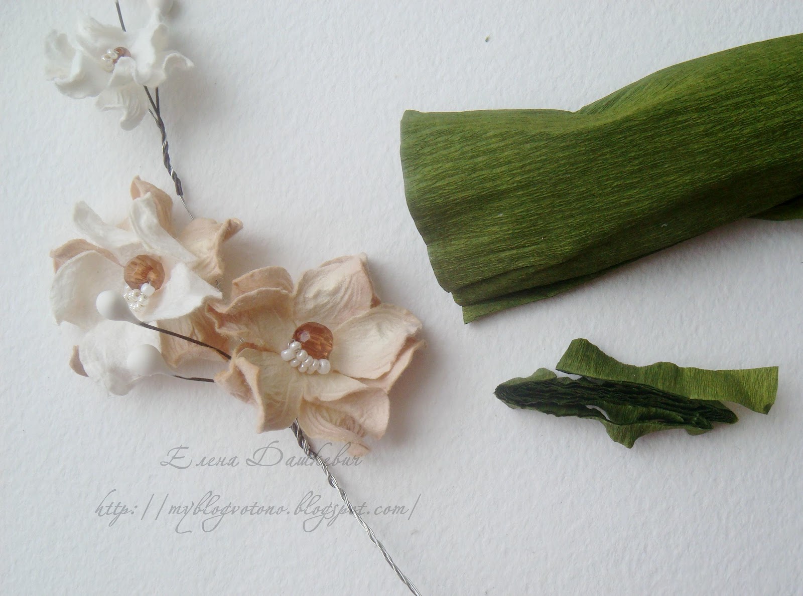Отрезаем узкую полоску креп-бумаги, закрепляем ее у основания цветочка с помощью клея ПВА и закручиваем ее вокруг проволоки (это можно делать и сразу во время формирования веточки, кому как удобнее):