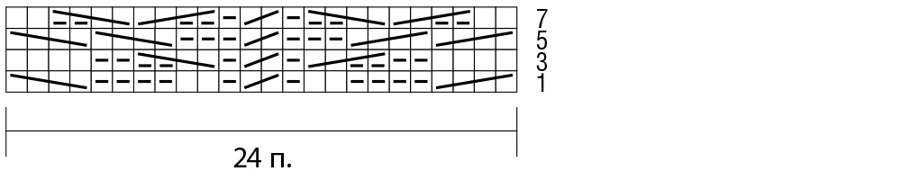 Вязать по схеме. На ней показаны лицевые ряды. Изнаночные ряды вязать по рисунку или по инструкции. Повторять 1—24-й ряды.