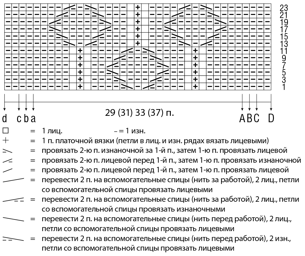 Перейти на спицы №7 и продолжить вязание со следующим распределением петель: 1 кром., 29 (31) 33 (37) п. узором «Ромбы», при этом начать у стрелки A (B) C (D) и закончить у стрелки a (b) c (d), 1 кром.