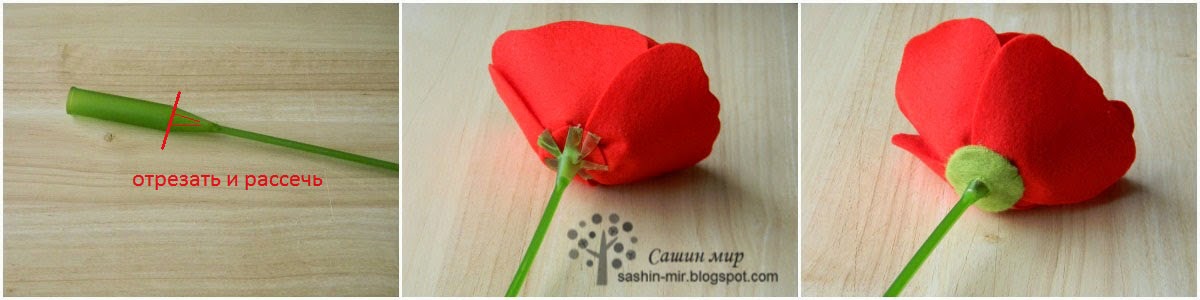 Для этого я использовала пластиковый флористический стебель. Верхнюю часть отрезаем резаком как на фото и рассекаем в "ромашку":) Теперь очень удобно капнув термоклей на каждый лепесток нашей "ромашки" приклеить стебель к цветку. Закрываем небольшим кружочком (d = 3,5см) зеленого фетра.
