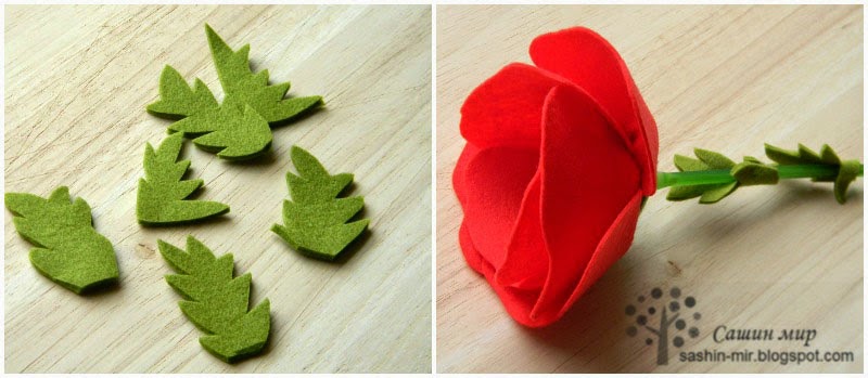 Абсолютно произвольно из кусочков зеленого фетра вырезаем листики, приблизительно 3 или 4см в длину. Капнув термоклей обернем листик вокруг стебля и поддержим до полного закрепления. Готово!