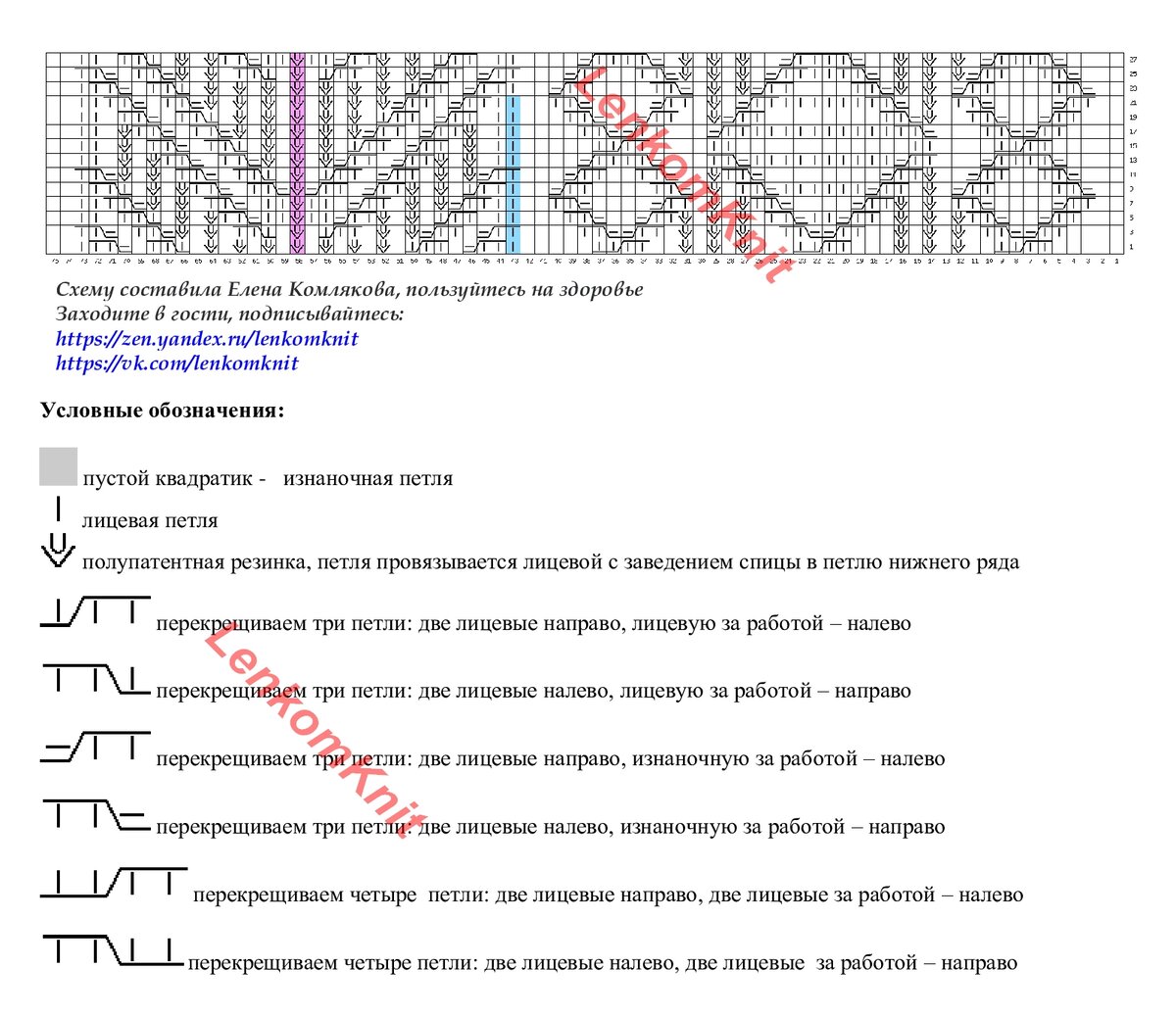 На схеме - один раппорт узора в высоту (40 рядов), а в ширину раппорт выделен внизу синим маркером (24 петли). Узор вяжется, начиная с третьего ряда (первый ряд - нулевой, он не считается, поскольку сделан для выделения раппорта).