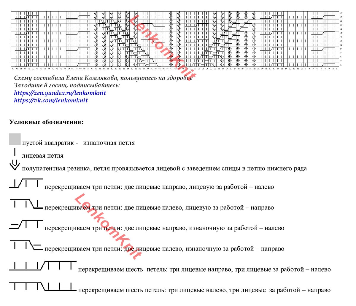 На рисунке - один раппорт теневого узора (20 петель в ширину и 32 ряда в высоту). Схема нарисована для лицевых рядов, петли в изнаночных рядах вяжутся по рисунку.