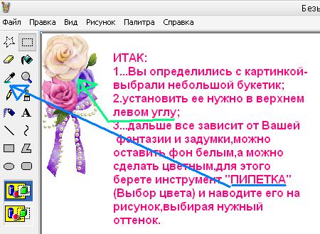 ...можно на этом и завершить процесс создания авторского бордюра , все зависит от Вашей фантазии и задумки...не сложно,например,фон сделать не белым,а цветным,воспользовавшись инструментом "ПИПЕТКА"(Выбор цвета)...для этого ,нажав на него левой кнопкой мышки , затем переходите на рисунок ,подбираете нужный оттенок.