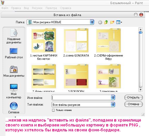 4...Вы попадаете в "хранилище"своего компьютера и выбираете небольшую картинку в соответствии с Вашим художественным замыслом;