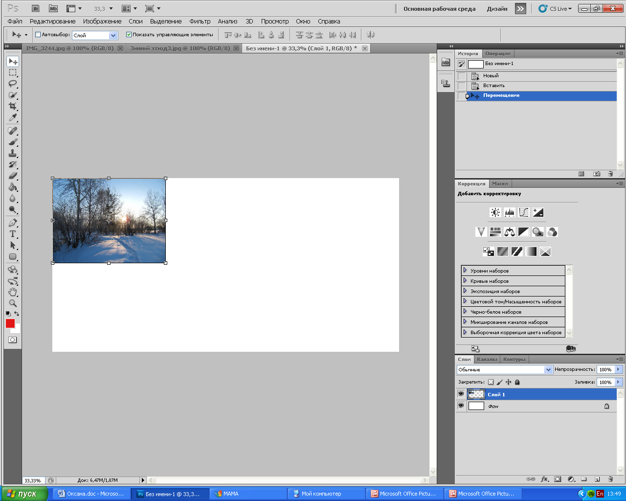 Далее возвращаемся к нашему белому слою и, поместив на него курсор нажимаем Ctrl+V. Вставляется скопированное изображение.