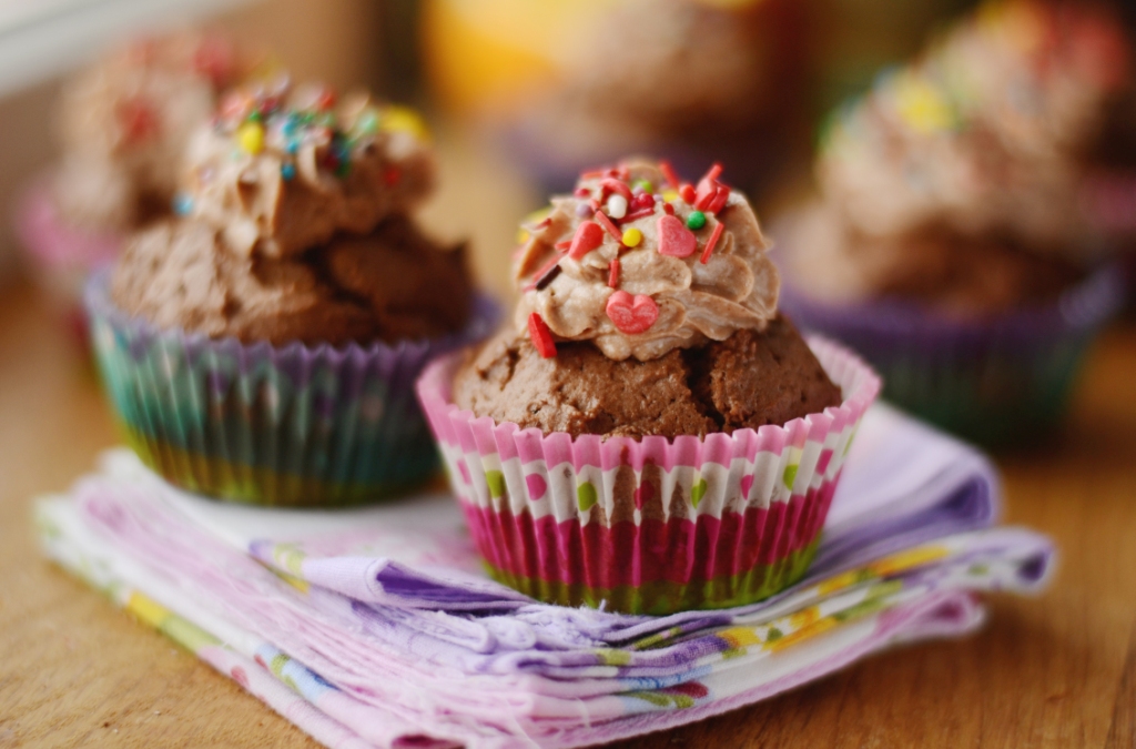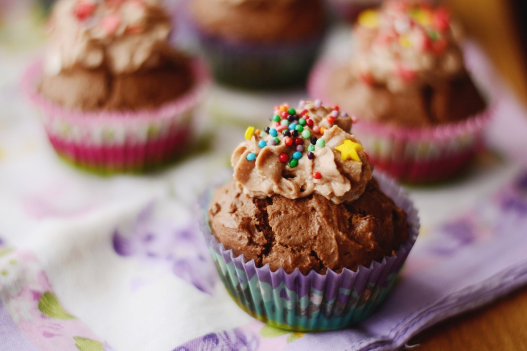 6. Переложить крем в кондитерский шприц/мешок и украсить кексы, посыпать посыпкой.