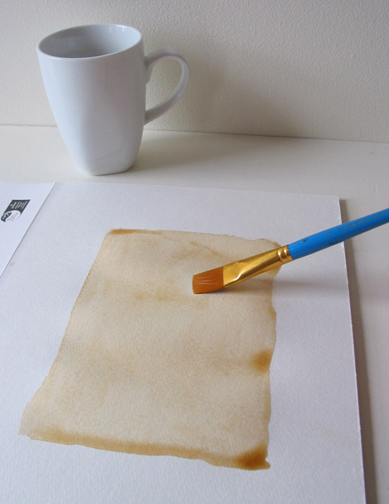 2. Применяем краситель на ваш выбор . Это моя любимая часть процесса! Начинаем с погружения кисти в краситель (в этом случае используется кофе) и намечаю область где будем рисовать. Надо сильно постараться, чтобы избежать прямых линий, потому что мы добиваемся вида рваных краев.