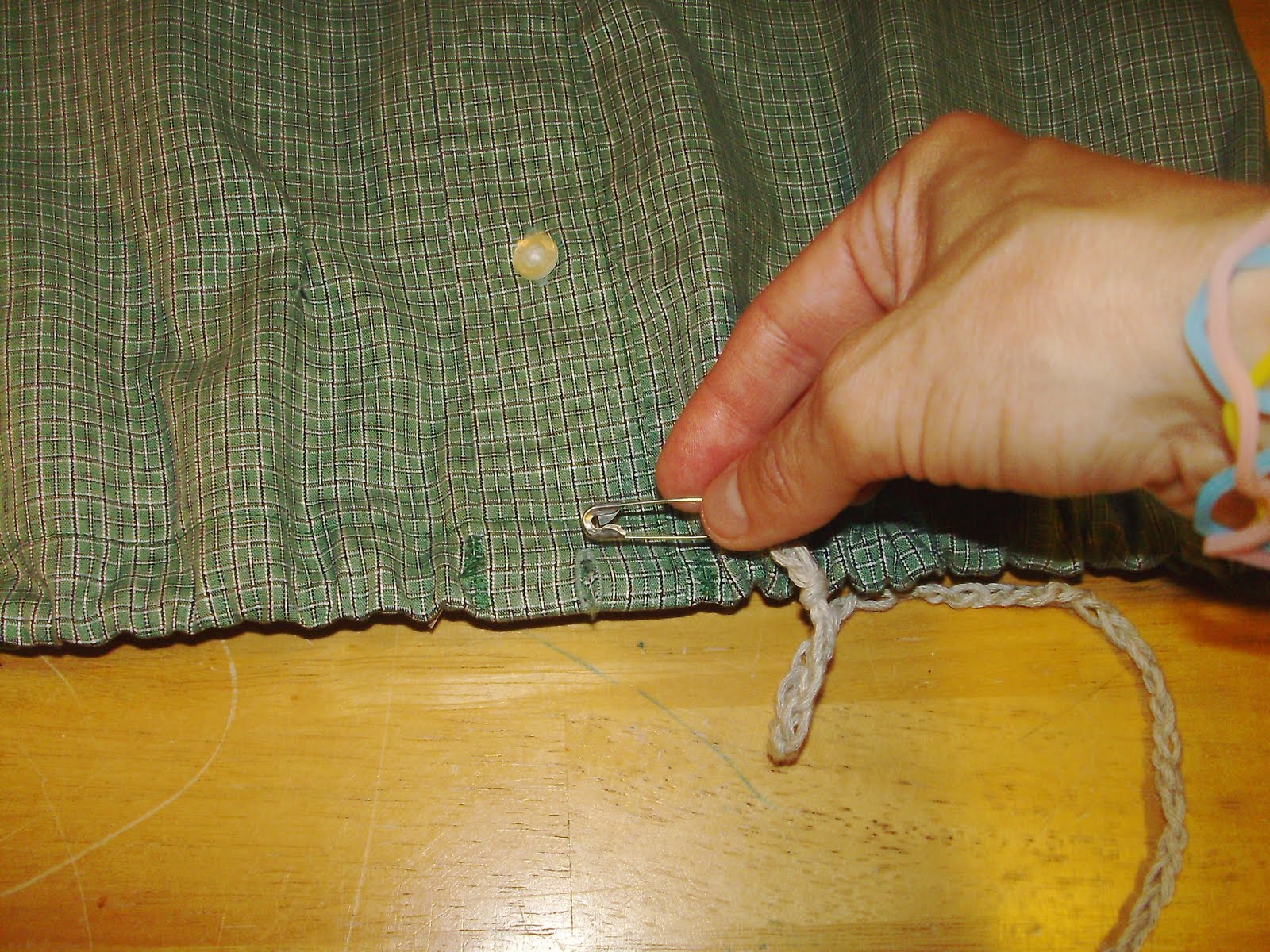 С помощью булавки, протягиваем шнур