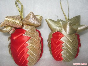Для этой поделки возьмите обычное пустое яйцо (лучше индюшиное, оно очень крепкое). Положите яйцо в сетку для овощей и завяжите, лишнее обрежьте. Возьмите две атласных ленты красного и золотого цвета. Нарежьте ленты длиной = ширина ленты х 2. Сложите ленты конвертиком..