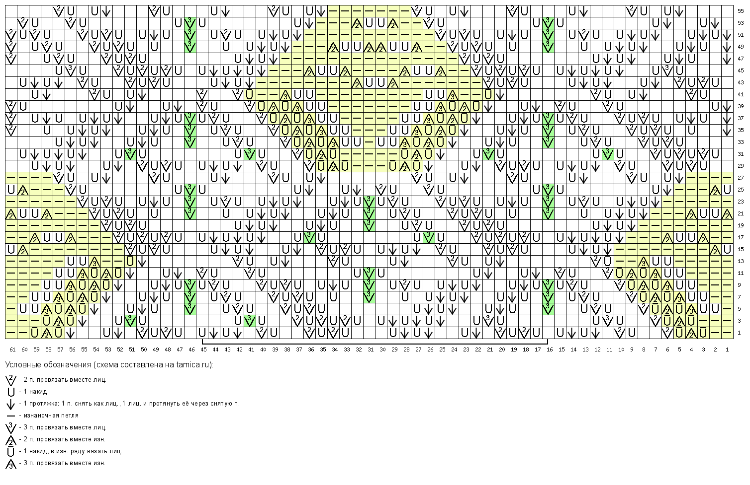 Для джемпера составлены два варианта схемы. Отличия между ними - размер отверстий в "изнаночных" ромбах (выделены желтым цветом для удобства). Перевернутых "изнаночных" ромбов тут нет.
