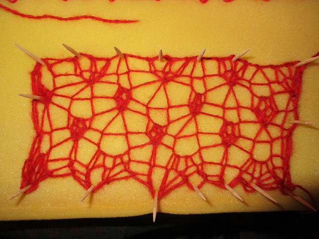 Я взяла спицы в 3 раза толще и пряжу в 3 раза тоньше.Связала ещё раз образец, очень сильно его растянула (до предела) и закрепила деревянными зубочистками на пенопласте.Оставила до полного высыхания. Когда это высохло-это меня просто шокировало! Вот что получилось: