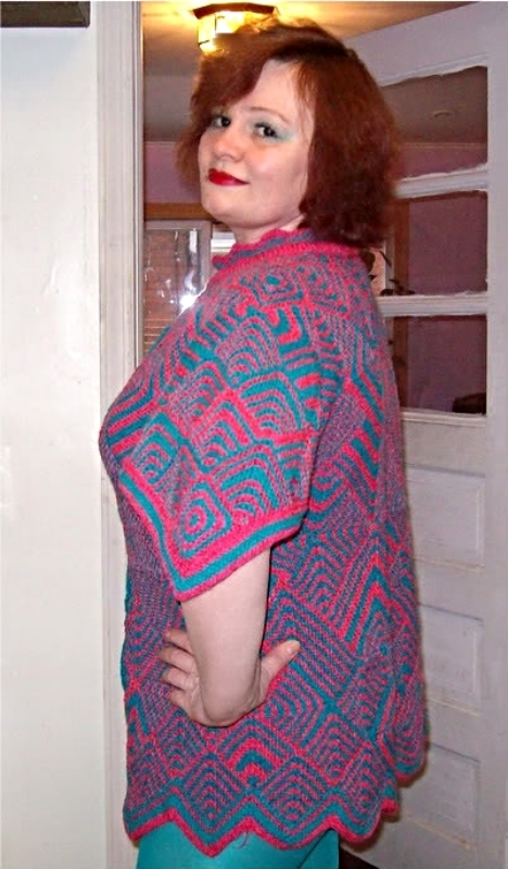 Исходное сообщение Мир_вязальщиц_ЛиРу Какая сложная работа! Великолепный результат. Очень понравилось. . Понедельник, 02 Мая 2016 г. 23:47 редактировать + в цитатник Расскажу и покажу на фото как я вязала кимоно в технике пэчворк. Может, кому-то понадобится в качестве идеи к собственному дизайну. O методах соединений,которые использовала: Я случайно догадалась вот так соединять мотивы, когда вязала шарфик методом недовязанных квадратов: И этот способ работает не хуже остальных Ведь главная цель--как можно меньшее количество раз оборвать нить. Сначала вывязывается центральный вертикальный ряд ромбов А именно--1-2-3-4-5-6. Теперь подробно Набрать 26 петель Убавляла в середине каждого лицевого ряда провязывая 2 вместе за задние стенки и 2 вместе за передние стенки Цветные нити чередуем каждых 2 ряда. 1 ряд-(зеленая нить)-- 11 лиц, 2 вм. за задние стенки, 2 вм. за передние стенки, 11 лиц. 2 ряд и все четные--по рис. 3 ряд--(розовая нить)-- 10 лиц ,2 вм. за задние, 2 вм. за передние, 10 лиц. Продолжать по сходному принципу. Последний раз провязать так 2 вместе лицевой+ 2 вместе лицевой. И вот что получилось A-- Затем в изн ряду обе петли провязать лицевыми и после этого будем переходить ко второму вертикальному ромбу Для этого наберем от отдельной ниточки на левую спицу 12 петель Затем переснимем оставшиеся 2 петли на левую спицу и наберем 12 петель справа от рабочей нити B-- Получилось по 12 петель по краям+ 2 центральные C-- С переходом к каждому новому ромбу-- нить перетягиватся по боковой стенке не обрываясь. Точно так же как при вывязывании жаккарда. D-- Смотрите розовая нить идет по стенке будущего ромба Вязать первый ряд второго ромба так: 1 ряд-- 11 лиц; 12-ю петлю зеленого цвета и 13-ю петлю розового цвета провязать как одну лицевую-обязательно за передние стенки. Далее провязать 1 лицевую, затем набрать дополнительно 11 петель. Повернуть вязание изнаночной стороной. 2 ряд и все четные--по рис. с 3 ряда--повторять рисунок первого ромба (с третьего ряда) ------------------------------------------------------------------------------------------- Вот уже 3 ромба E-- ---------------------------------------------------------------------------------------------------- Вот уже вывязаны все 6 ромбов в высоту сообразно чертежу F-- Теперь надо вязать седьмой ромб--поперечно. Нить можно оборвать на вершине шестого ромба и подвязать новую. Но я очень нитки жалею --поэтому опять же Протянула по стенке ромба чтоб не обрывать Набрать по наклонным стенкам 5-го и 6-го ромбов-- 26 петель (13+13) и вязать по принципу описанному выше. Вот так красиво состыковались полосочki G-- А вот это ошибочный вариант или нетрадиционный. Вернее, так тоже можно, но намного сложнее. Но все ж покажу что вышло б из такого способа соединения. ---------------------------------------------------------------------------------------------------- Следующий 8-й ромб поведем от той же нити. Он будет большим. Набираем 24 петли по стенкам ромбов 7 и 5. Затем делаем 2 центральные петли из маленькой розовой области в серединке. Потом набираем 12 петель по стенке 4-го ромба. И наконец, набираем дополнительно 12 петель- в конце. Всего получается 50 петель (включая центральные). Вяжем по сходному принципу. Вот что получилось: H-- -------------------------------------------------------------------------------------------- Теперь получается что девятый квадрат зажат между тремя стенками Попробовала вязать набрав по двум наклонным стенкам и присоединяя последнюю петлю к стенке восьмого ромба--очень получилось топорно и некрасиво ВЫХОД О