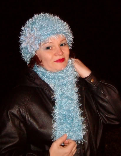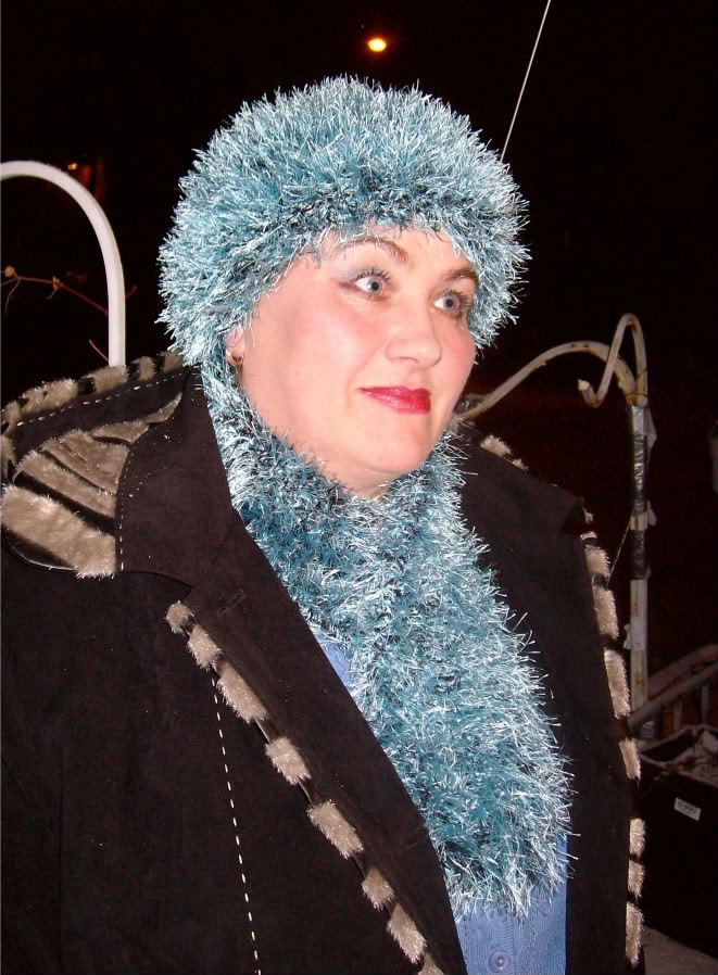 Сюда я примотала стальную ниточку с люрексом.(Клубочек тоже-из посылочки). Шапочка получилась сияющая,особенно часто я носила её на каток, где она вся переливалась под светом вечерних огней.