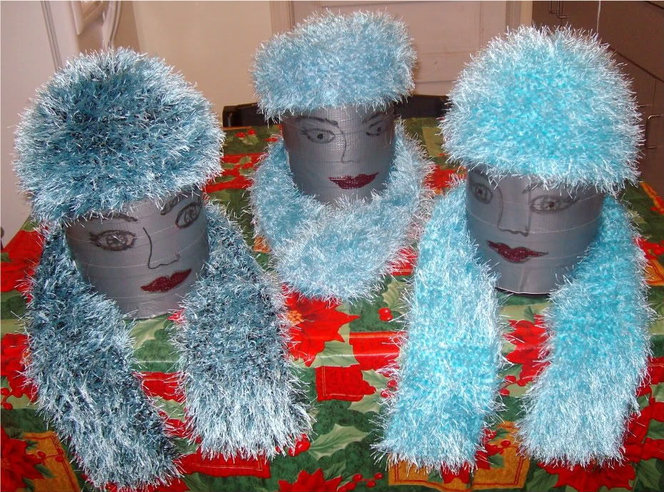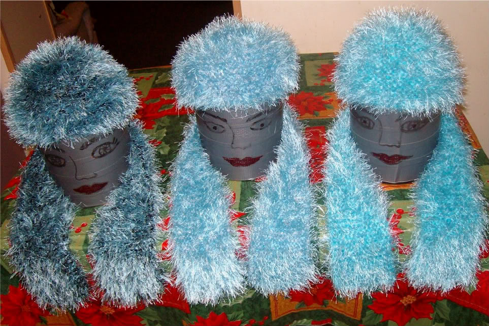 Для Анны мы решили разбавить голубой цвет-чёрным, распустив старые анькины гольфы, (только верхушки гольф )и получив тонкую безразмерную нитку. Шапочка хорошо сжималась и фиксировалась на голове за счёт такой ниточки.