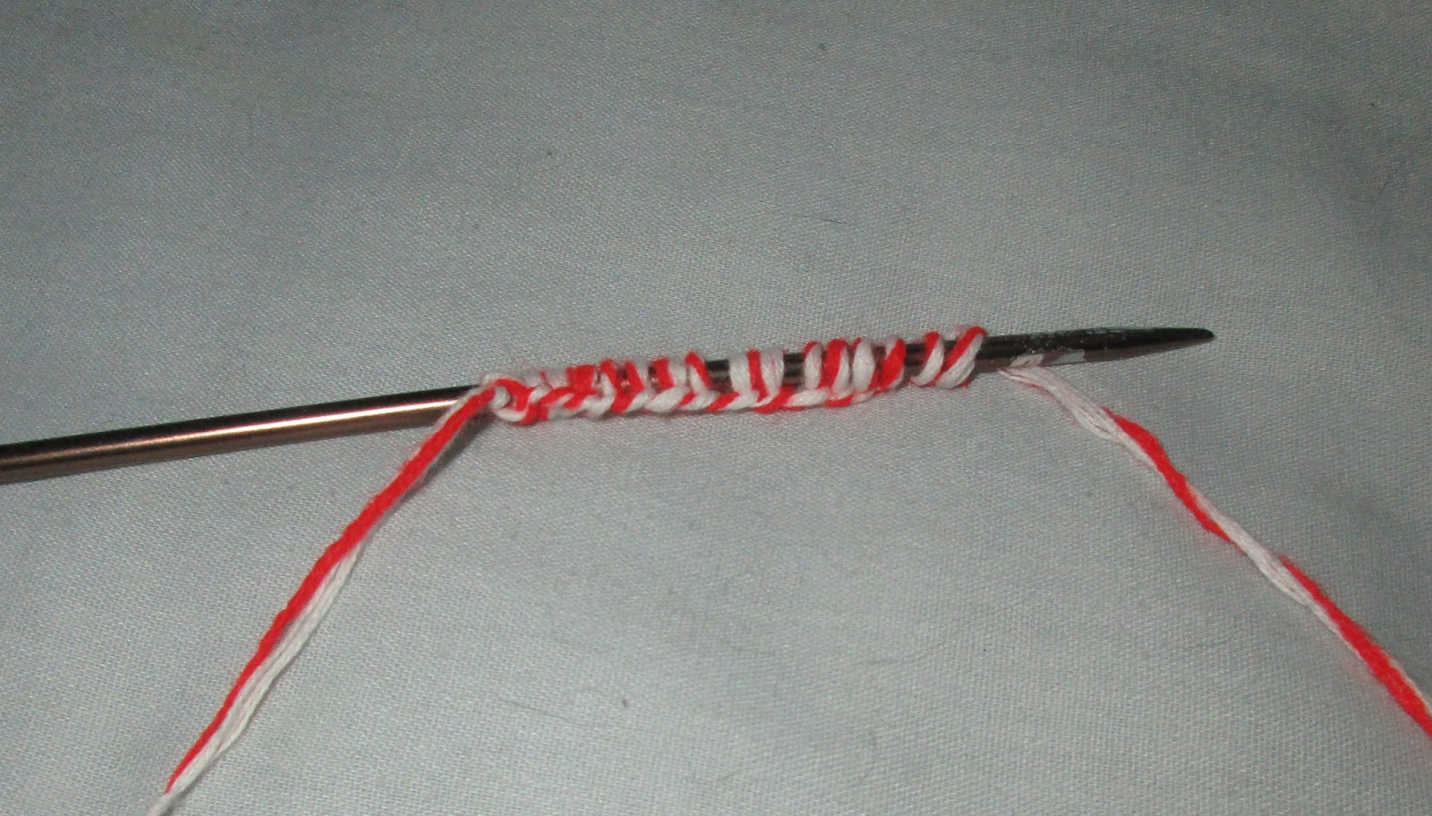 9 ряд-вытянуть дополн. петлю из кромочной петли низлежащего ряда и надеть её на левую спицу.Провязать все 8 петель-лицевыми. В конце ряда вытянуть допол. петлю из краевой петли низлежащего ряда и надет; на лев.спицу, затем провязать её девятой, лицевой петлёй. (Петли вытягивать там, где показано стрелками).