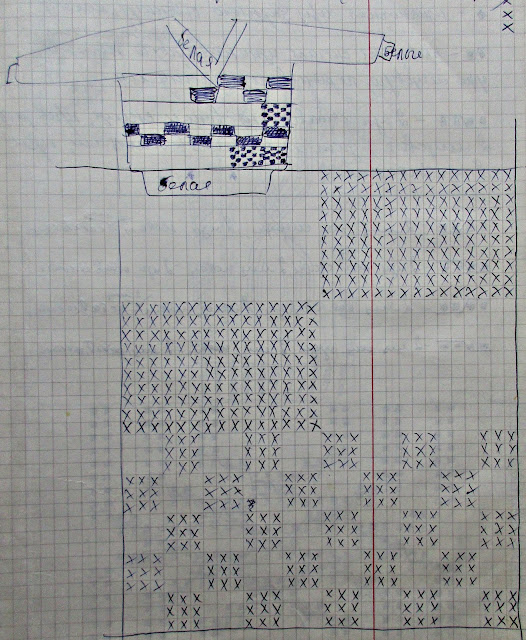 Начинаем с квадрата в *6 петель ширины и 8 рядов в высоту. Вяжем 2 раппорта. Затем 2 раппорта-по 6 рядов в высоту, 2 паппорта по 4 ряда, 4 раппорта по 2 ряда,4 раппортв по одному ряду.* А потом всё то, что между звёздочками- повторяем в зеркальном порядке.