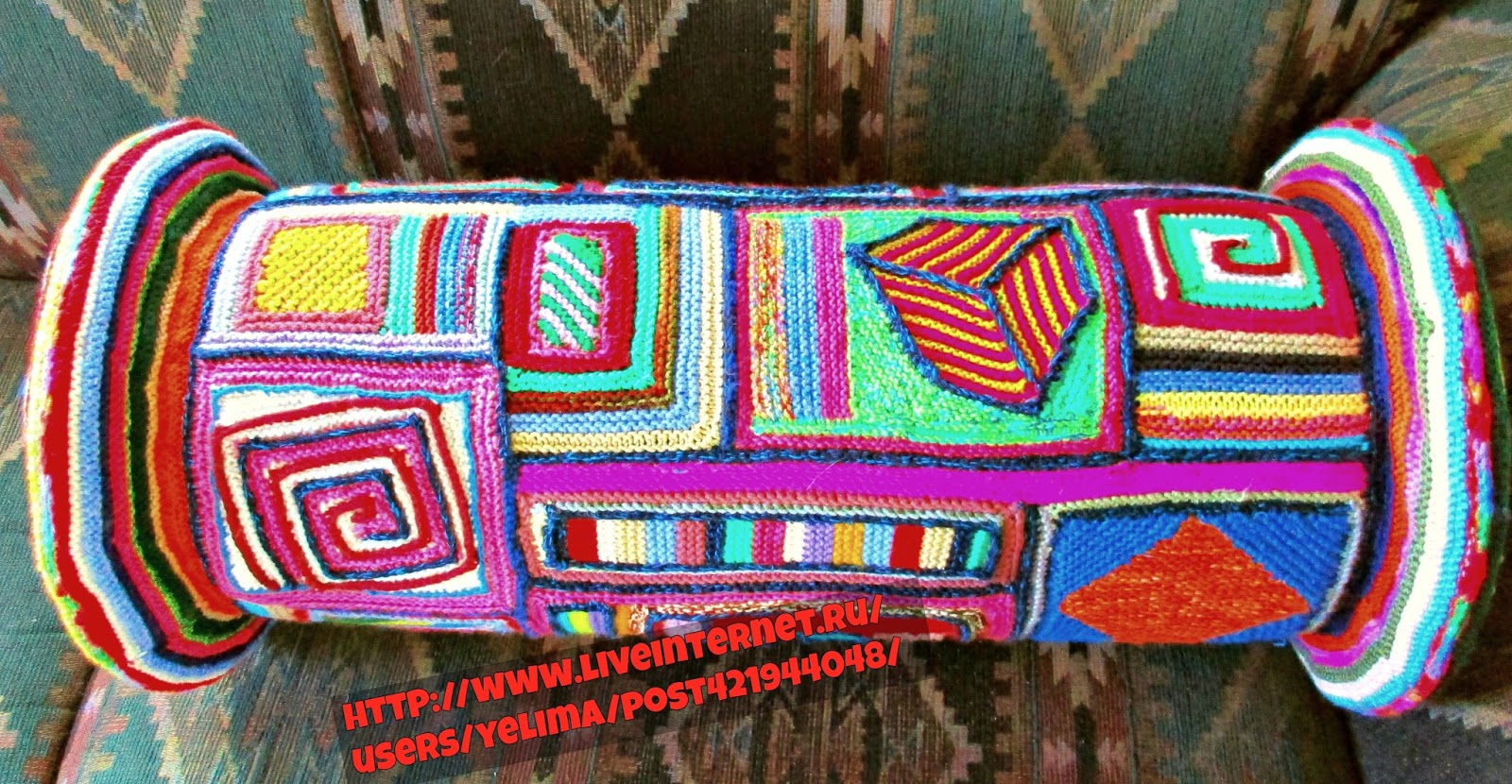 Исходное сообщение Мир_вязальщиц_ЛиРу Красивая!!! Вы молодец! Как говорится, не прошло и года...как подушку я, наконец, довела до полного завершения. А вернее, прошло ровно полгода, так как начала я возиться с этими вязаными лоскутками ещё в марте. Идея была: пустить в дело все образцы провязок и мастер-классов,связав конкретную модель. Честно скажу, что легче было бы просто связать подуху заново, из новой пряжи. Не так-то и легко лоскутки соединить в красивый гармоничный дизайн. Два раза бросала недоделку... но вот теперь завешила окончательно. Показываю узоры со всех сторон. Результатом я даже очень довольна. По крайней мере, точно такой вот подушки-катушки нет нигде и ни у кого. Объясню,почему именно катушка, а не обычный тубус, получилась. Боковые ''колёса'' были достаточно большими по диаметру, а если их уменьшить, то узор уже сломается и будет не так красиво. Я если само тело подушки увеличить до размеров кругов-получится толстенное бревно.Будет неудобно ей пользоваться. Вот я и придумала бока нарастить такими вязанными трубками, наполненными ватой.Таким образом, я ''обманула'' 6-7 см в диаметре Чтоб они были более устойчивыми и лучше держали форму-подшила двойные трубки, немного разного диаметра, с обеих боков. Получилось даже очень прочно. -------------------------------------- Дальше продолжаю показывать готовую подушку: Боковины нисколько не мешают использовать подушку по назначению, которое я ей (подушке) определила: подпираю шею и вернюю часть спины, когда вяжу полу-лёжа. С прямой спиной на стуле уже не могу вязать часами, позвоночник ''ныть'' начинает... Много я перепробовала вариантов соединения лоскутков,в процессе изготовления подушки, но всё не нравилось. Тогда решила сделать очень просто: соединяла все мотивы тёмносиним цветом, прямо по лицевой стороне. Заодно ещё провязала дополнительные дорожки прямо по верху вязаной ткани,разными цветами пряж,чтобы все краски и цвета ещё сильнее спестрились. В последний момент все накрученные слои старых одеял и ткани-убрала, заменив нутро поролоном. Оставила только 2 тонких слоя. от этого вес подушки сразу полегчал вдвое. Подушка весит только 860 грамм при её немаленьком объёме. Вот такое вязаное чудо у меня родилось. ------------------ P.S.-По сравнению с другими моими многоцветными подушками-она самая интересная, и многотрудная в выполнении.