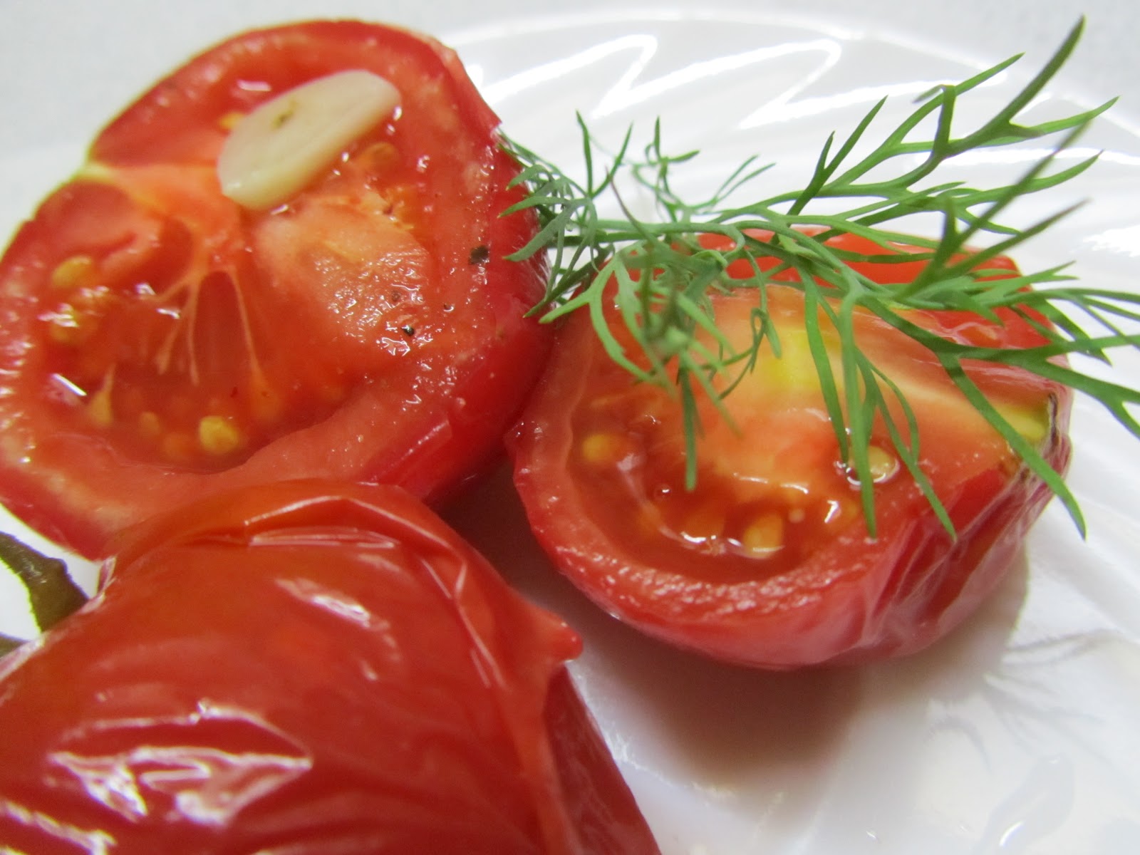 Помидорки приготовленные мною, по рецепту Натахан с сайта "Едим дома". Может, у кого-то ещё есть пристрастие к таким помидорам. Попробуйте! Не пожалеете.