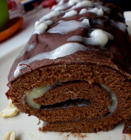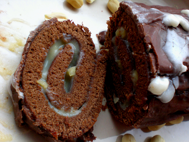 сборка: тесто вылить на смазанный маслом противень, разровнять, выпекать 10-15 мин, готовый бисквит быстро намазать начинкой и еще быстрее свернуть, ибо в противном случае он потрескается или порвется;