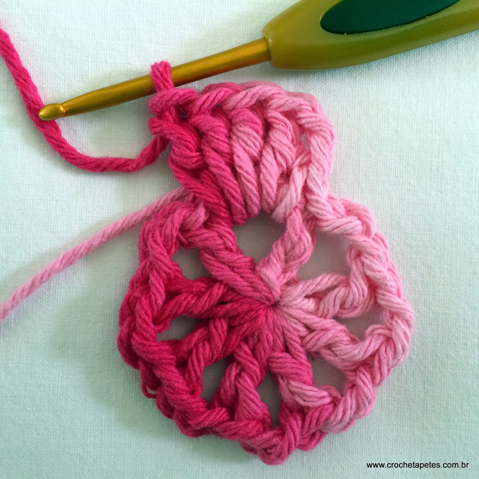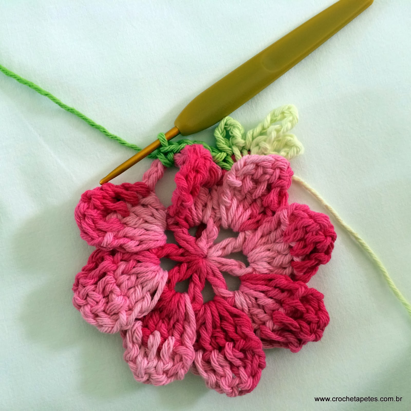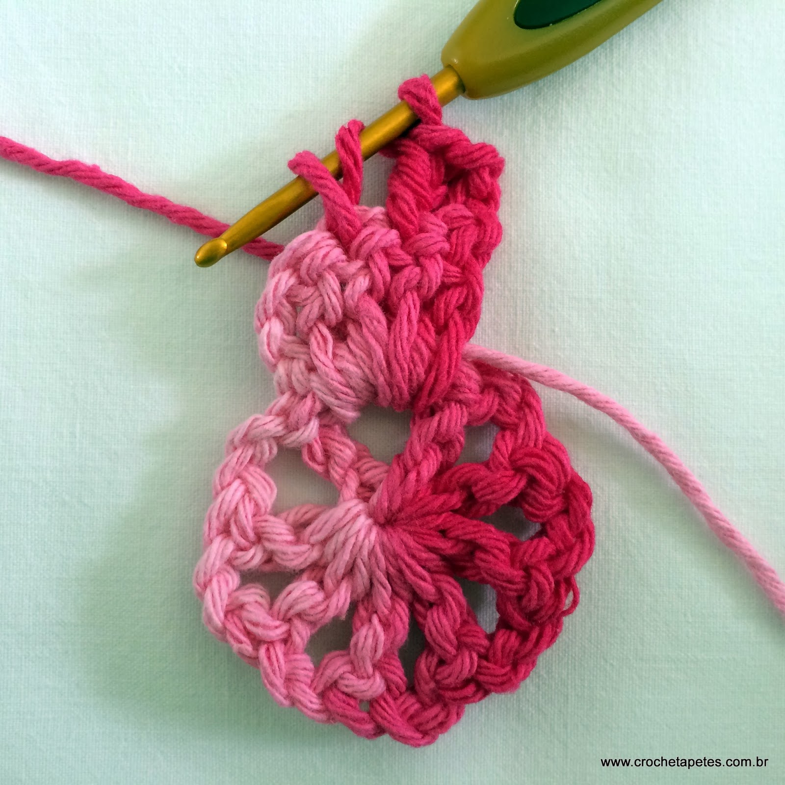 10- Suba com duas correntes e agora preste bem atenção, estamos trabalhando pelo lado direito da flor.