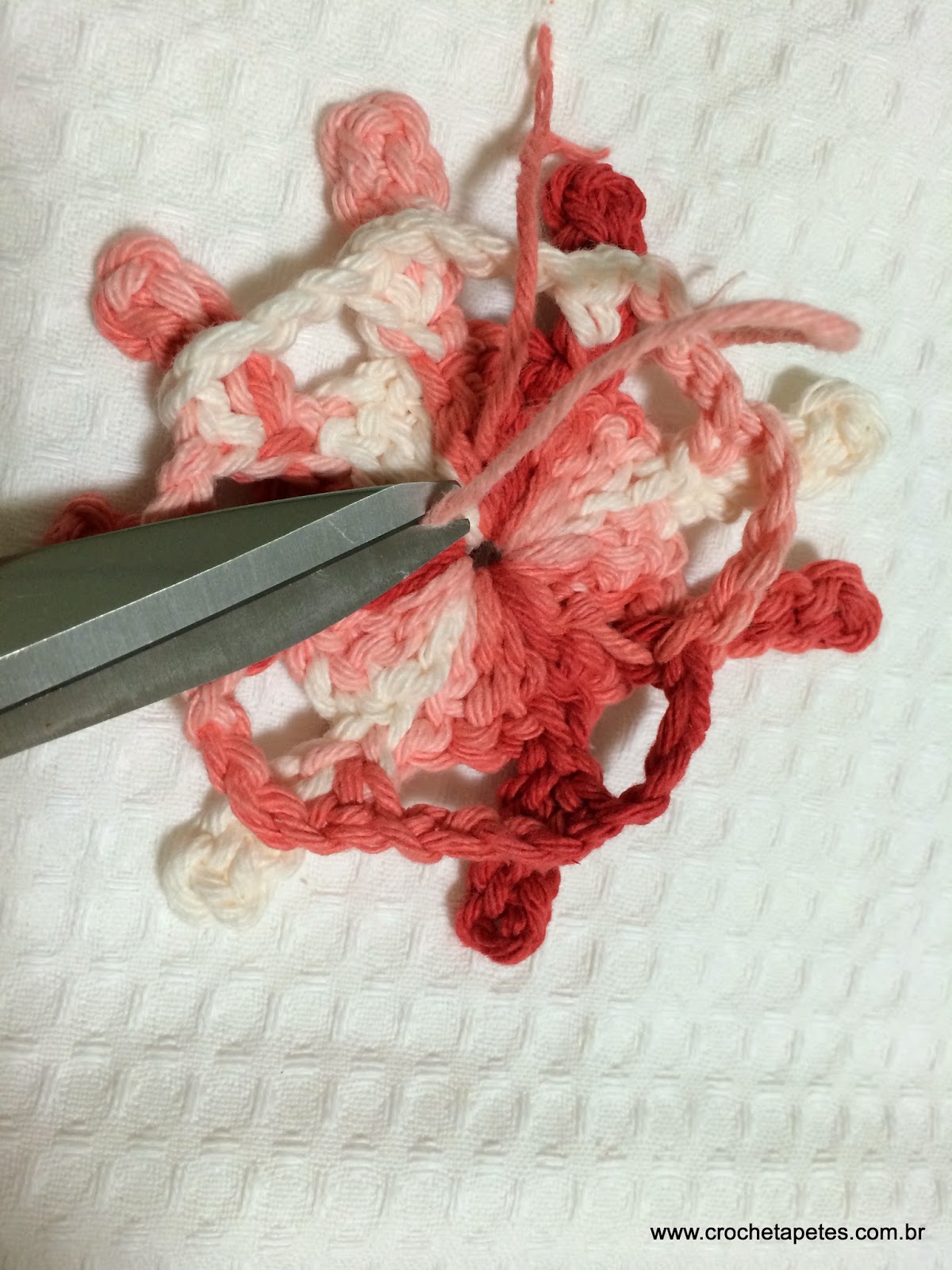 17 - No ponto alto de base que está no meio dos dois cabinhos prenda com ponto baixo, repita o procedimento nos cabinhos seguintes para fazer as outras pétalas.