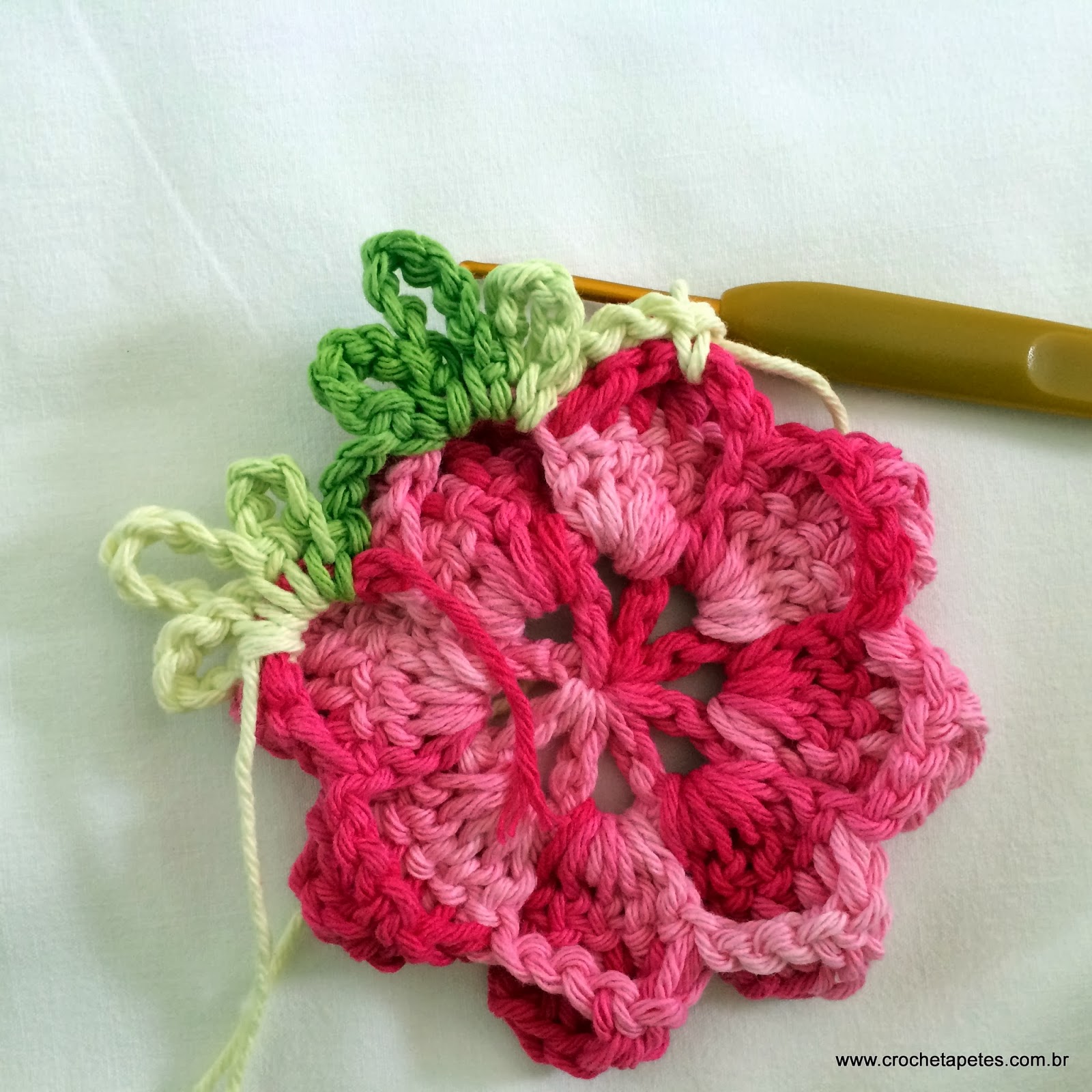 12 - Suba com 3 correntes, e vamos voltar a trabalhar pelo lado direito da flor, estas 3 correntes será a alça atrás da pétala. Então enrole a linha na agulha para fazer ponto alto e vire a flor pro lado direito novamente.