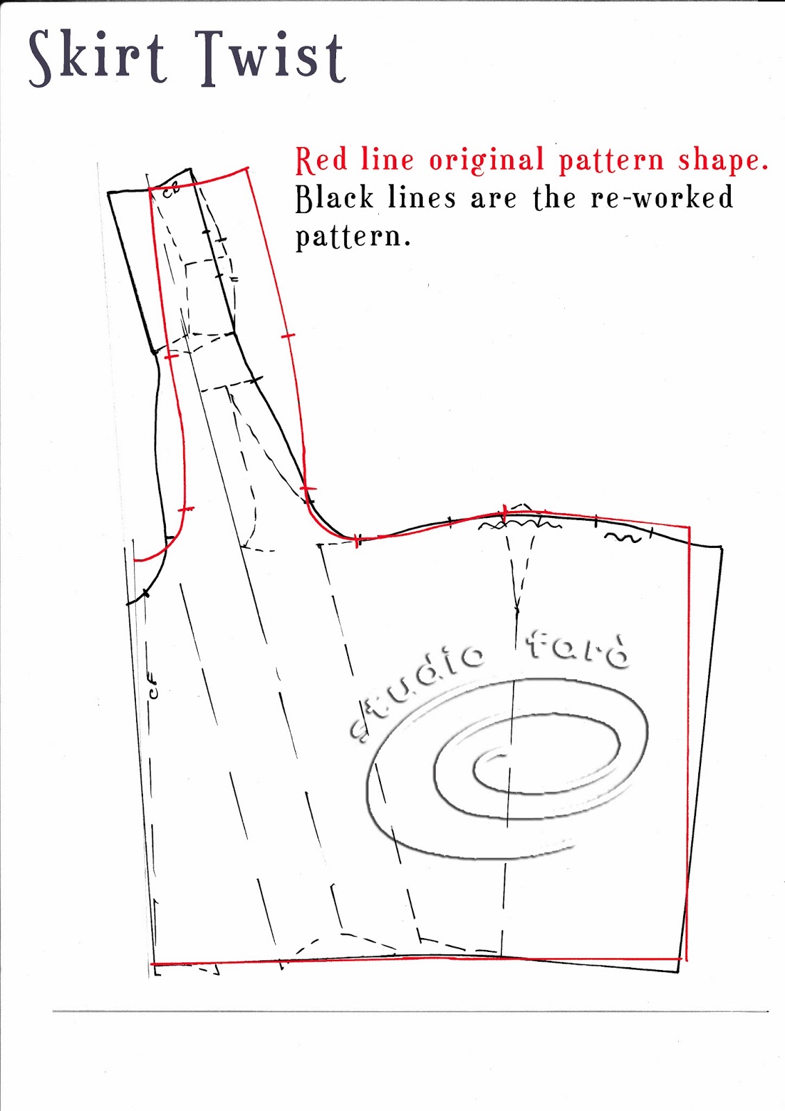 Итак, вернемся к структуре таблицы замять форму шаблона. Я переработал плане шаблона со следующими изменениями - больший угол на передней обертывание, лифт в длину юбки CF и более сужающийся на боковых швов к подолу.