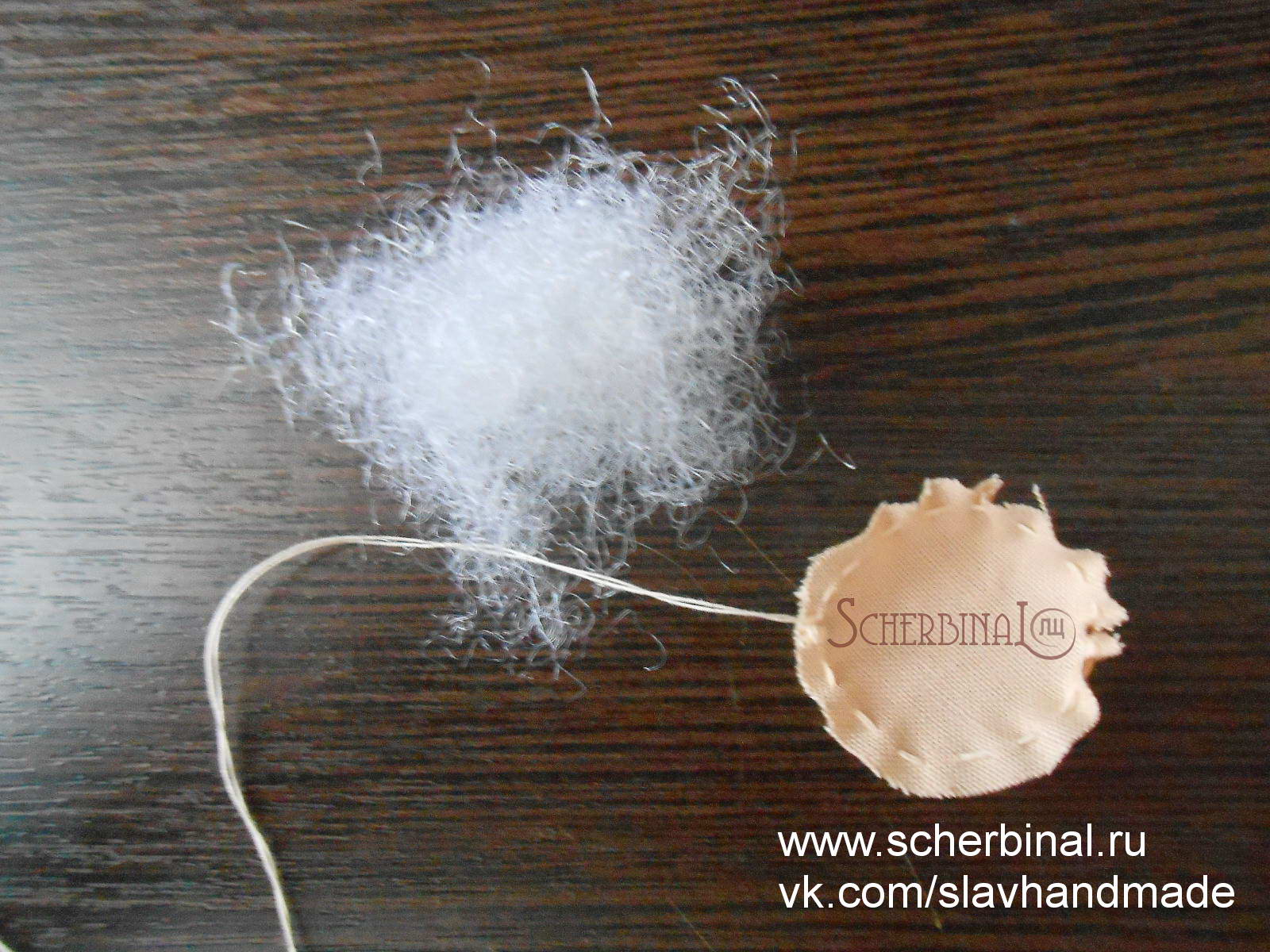 Собираем носик. Для этого вырезаем кружочек, собираем его на нитку по периметру и заполняем получившийся мешочек наполнителем.