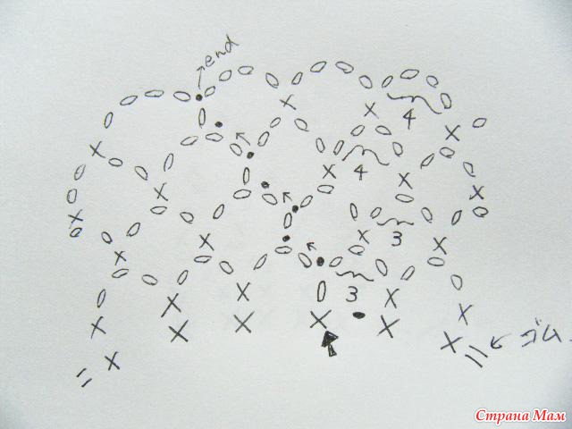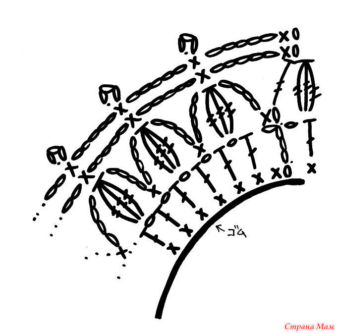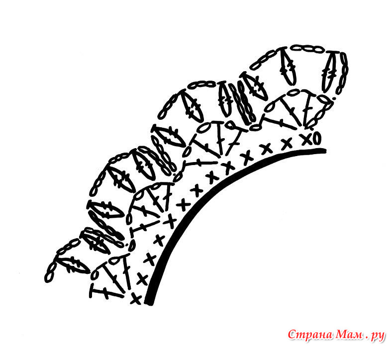 2 ряд: Повторять 3 в. п., СБН, пропуская один столбик под аркой из воздушных петель.