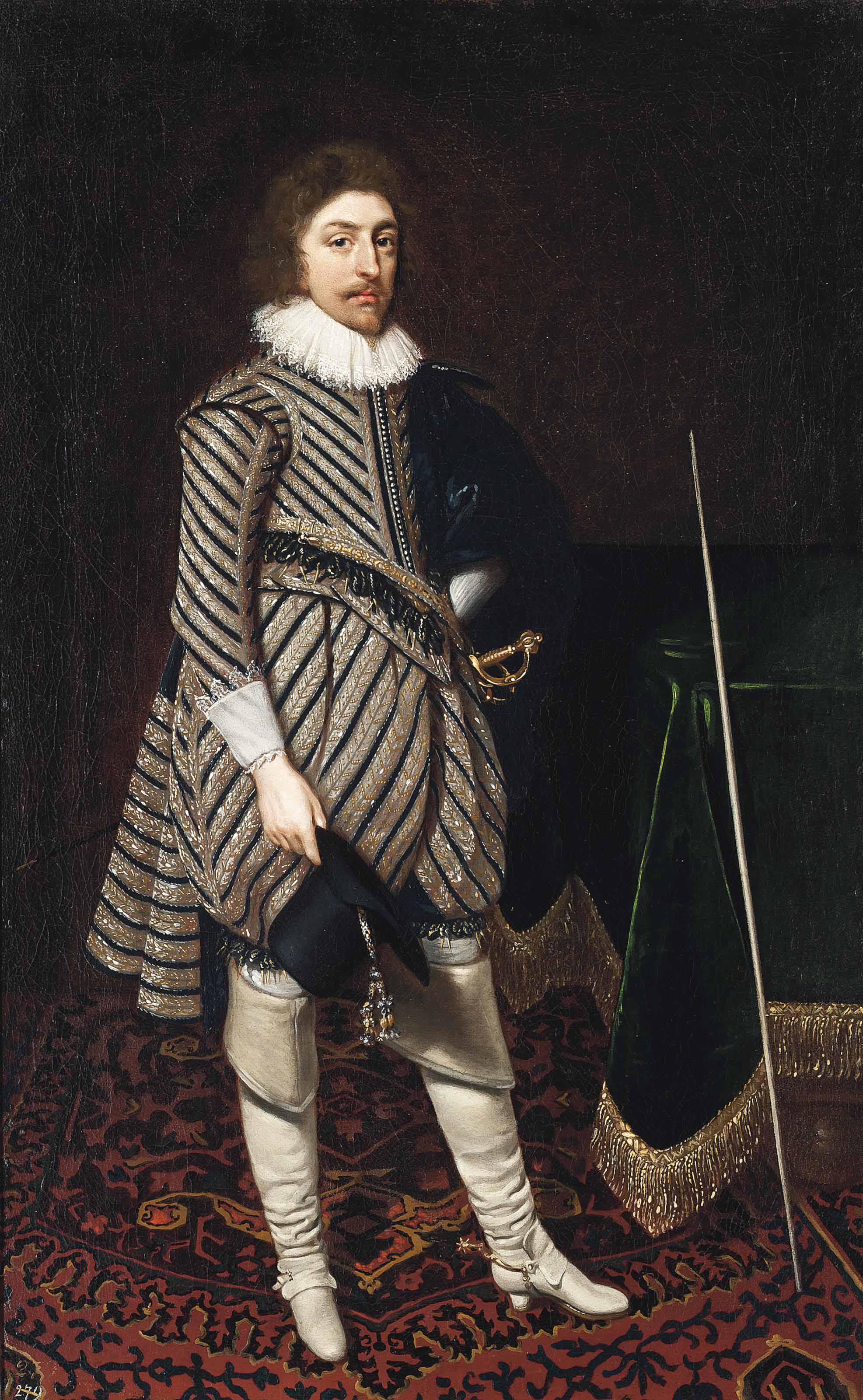 Portrait of a gentleman, thought to be Henry de Vere, 18th Earl of Oxford KB (1593-1625), small full-length, in a silver embroidered black slashed doublet and hose, holding his black hat in his right hand, his wand of office against a draped table at his side