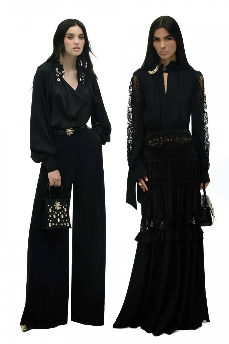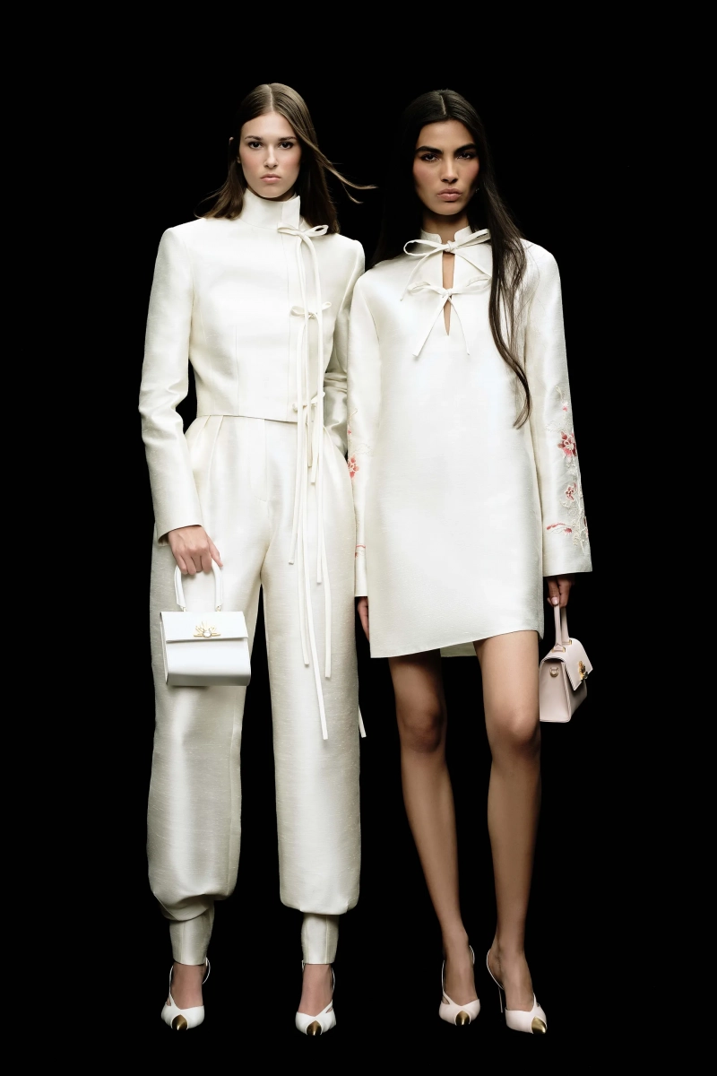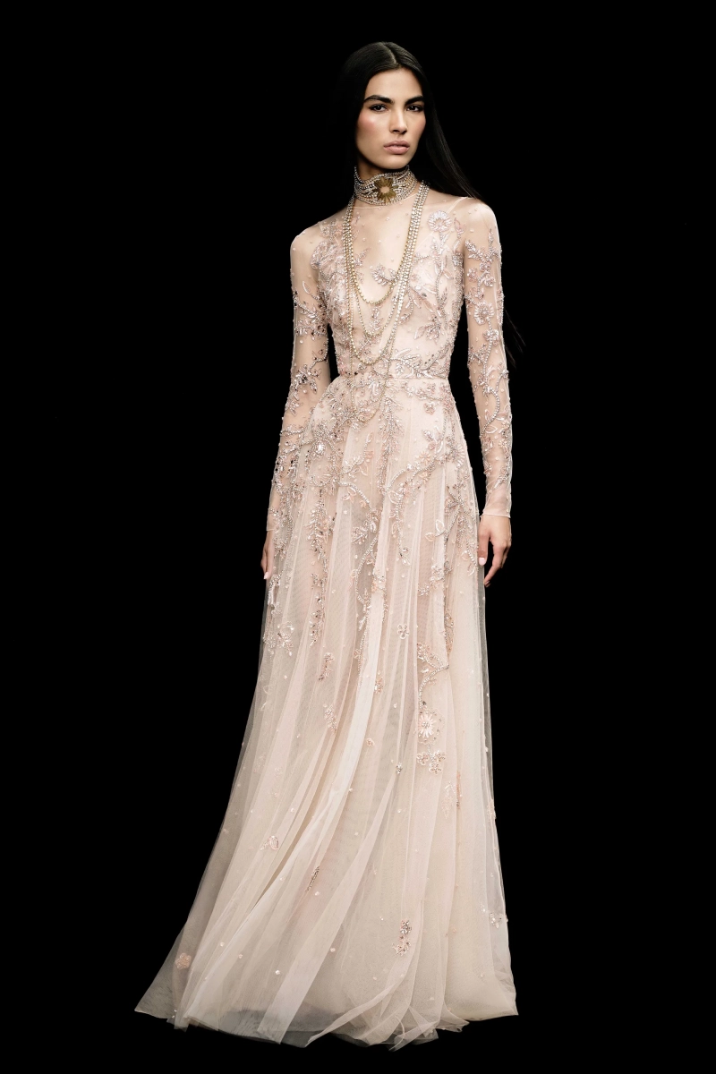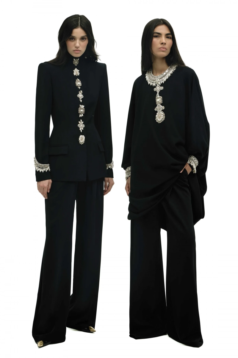 Черпая вдохновение из декадентской ориенталистской эстетики начала 20 века, Мурад создает историю винтажного романа, пронизанного тихим восстанием. Искусственные жемчуга, сверкающие кристаллы и металлическая вышивка — это не аксессуары, они дышат в ткани, образуя скульптурные ожерелья, небесные броши, сложные подвязки и мягко сверкающие инкрустации. Эта коллекция не украшает — она трансформирует.