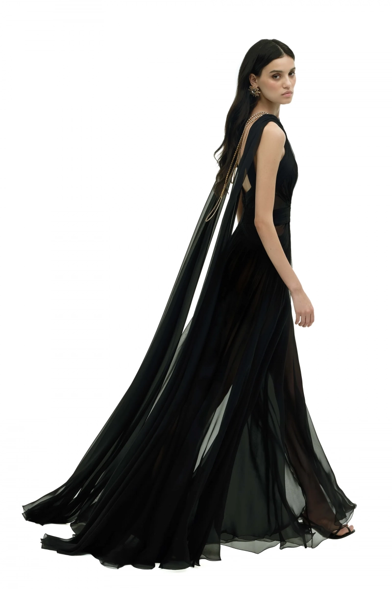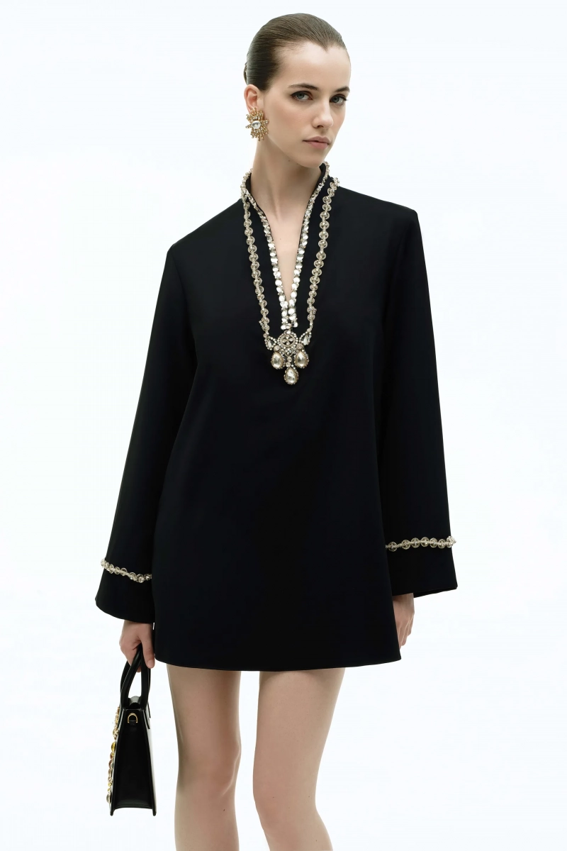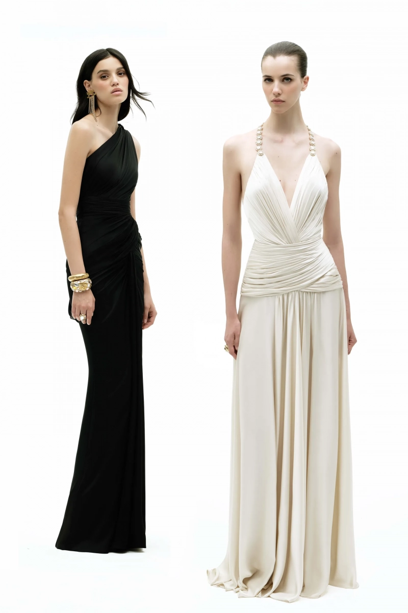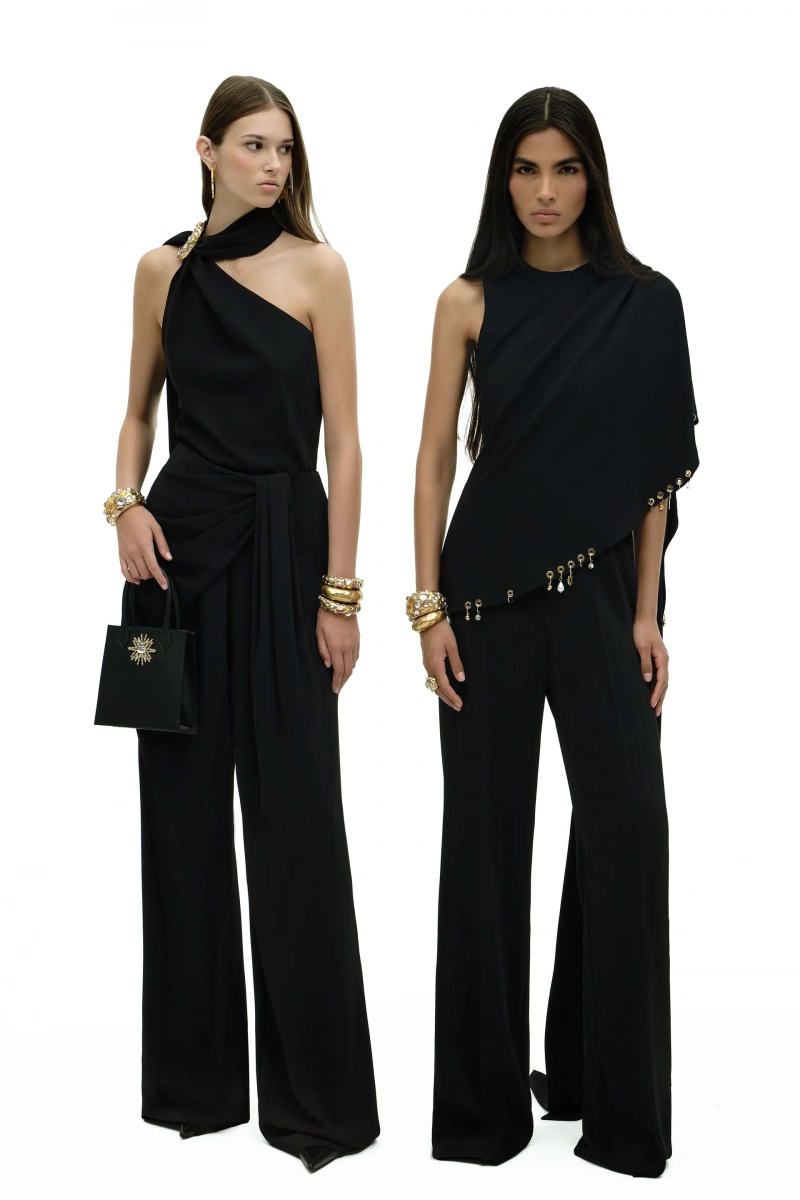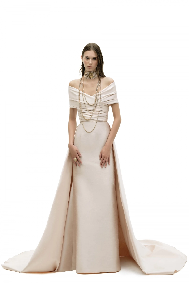 Черпая вдохновение из декадентской ориенталистской эстетики начала 20 века, Мурад создает историю винтажного романа, пронизанного тихим восстанием. Искусственные жемчуга, сверкающие кристаллы и металлическая вышивка — это не аксессуары, они дышат в ткани, образуя скульптурные ожерелья, небесные броши, сложные подвязки и мягко сверкающие инкрустации. Эта коллекция не украшает — она трансформирует.