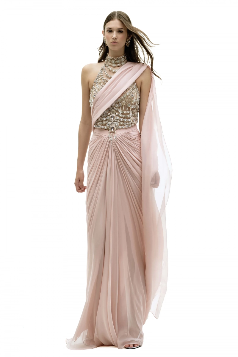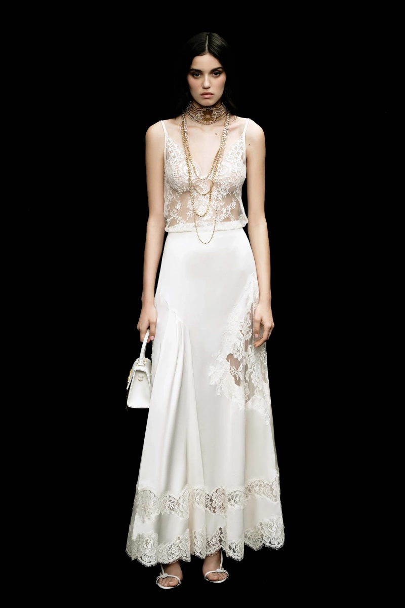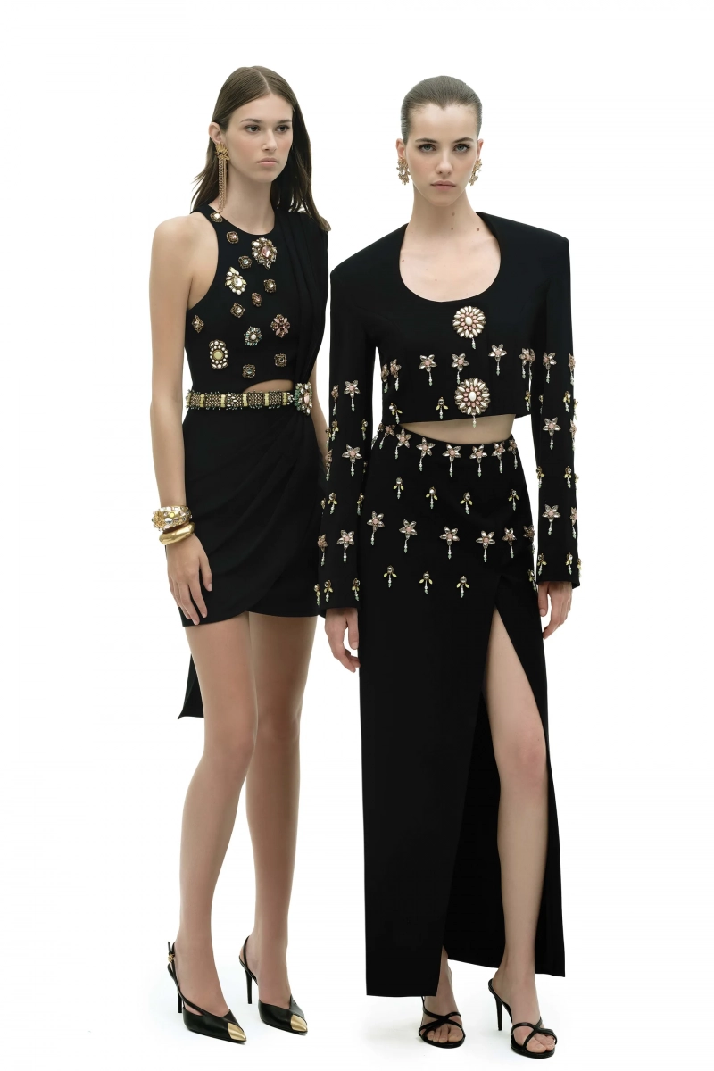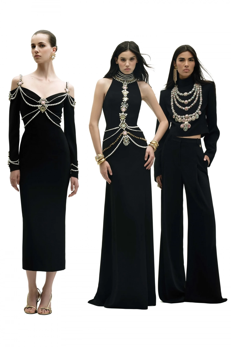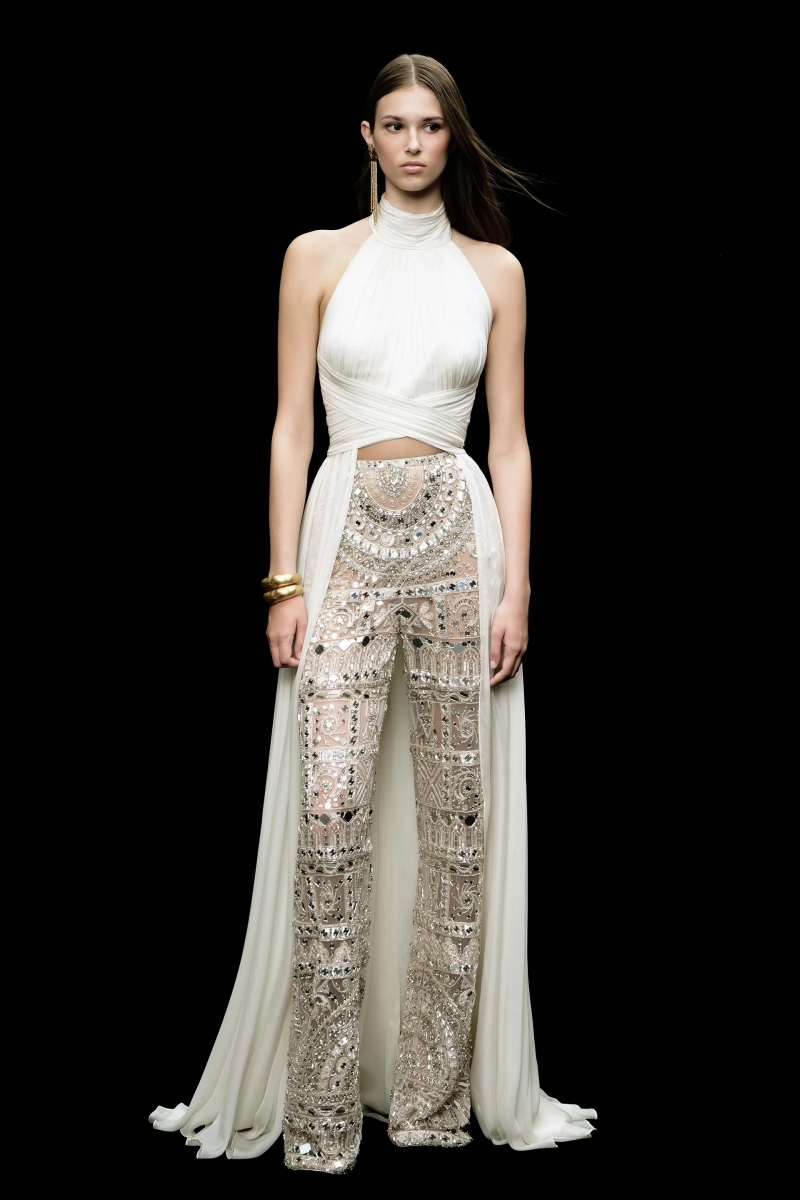 Standout pieces defy expectation. A jeweled body harness, cascading like liquid armor from neck to hip, moves like a second skin—evocative, empowered. A mesh bodysuit laced in gemstone mosaic flirts with the line between sensuality and sculpture. Elsewhere, a tailored blazer becomes a storytelling vessel, its integrated scarf laced with pearls and miniature charms, like fragments of a modern heirloom.