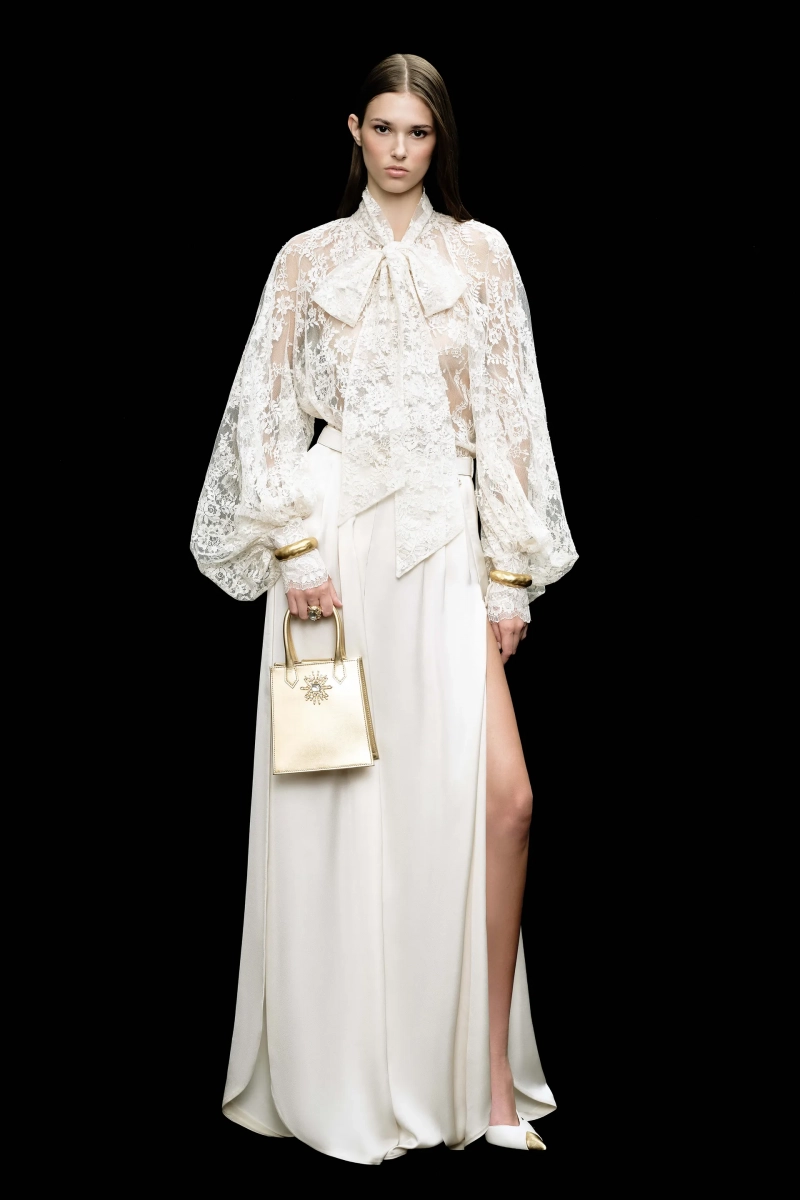 Силуэты Мурада колеблются между эфемерным и неожиданным: да, это прозрачные платья — но также и шароварчики с рифлеными щиколотками, свободные комбинезоны с кристаллическими отделками и туники из шантунгского шелка, украшенные деликатными завязками и цветочной вышивкой. Каждая деталь приглашает остановиться. Каждое изделие рассказывает свою историю.