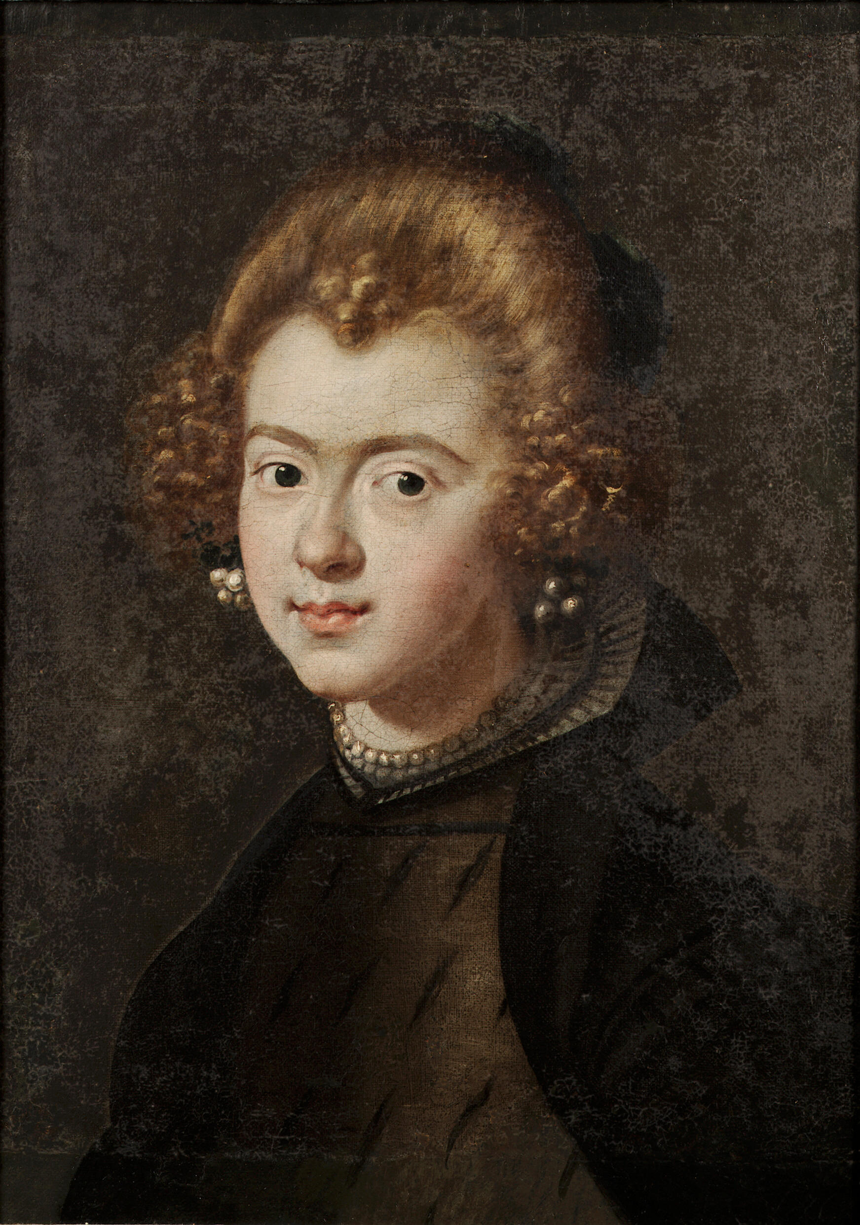 Portrait of a lady, bust-length, in a grey slashed dress and a black wrap, with a lace collar and pearl choker and earrings