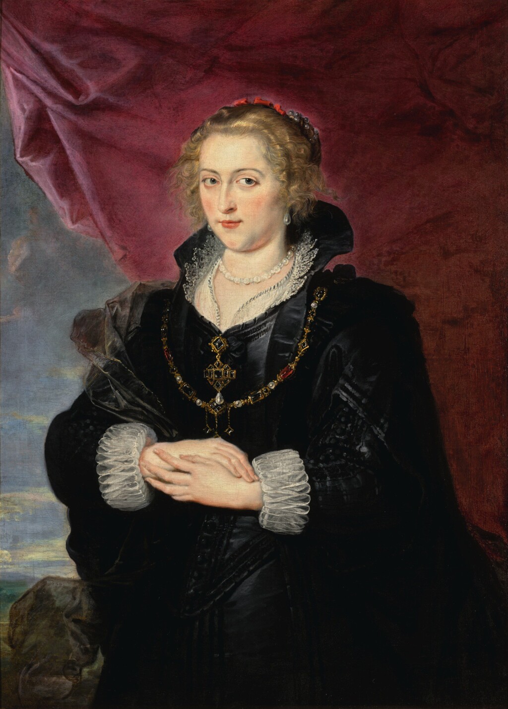 PORTRAIT OF A LADY, THREE-QUARTER LENGTH, WEARING AN ELABORATE BLACK DRESS AND CLOAK, BEFORE A RED DRAPE AND A DISTANT LANDSCAPE