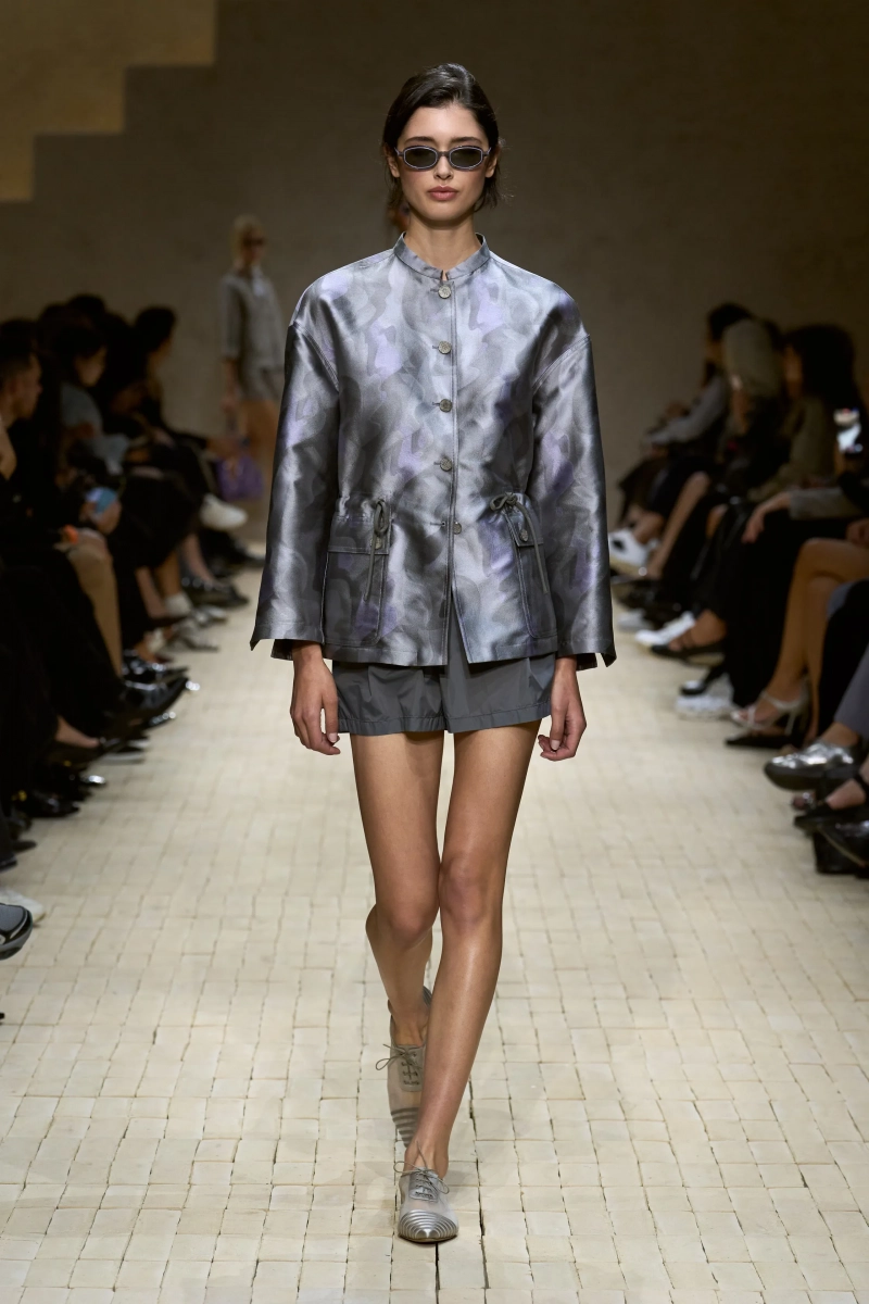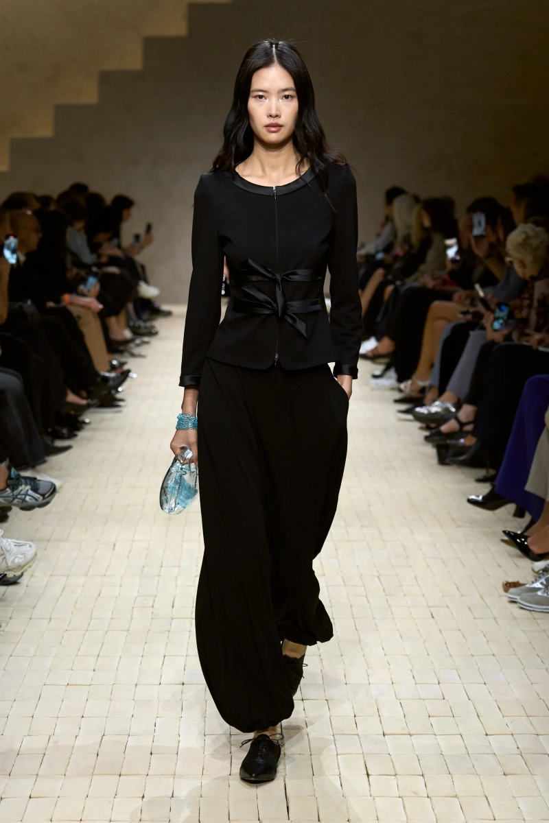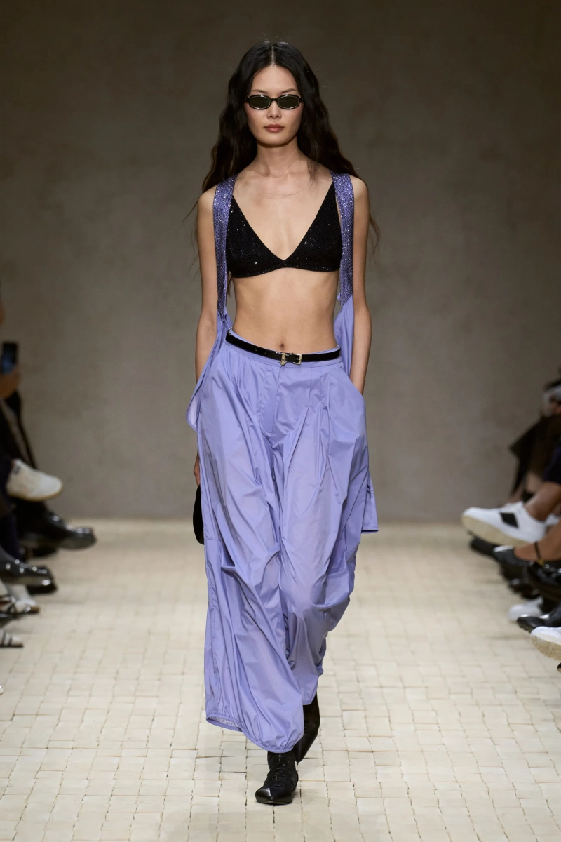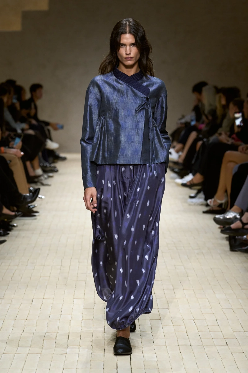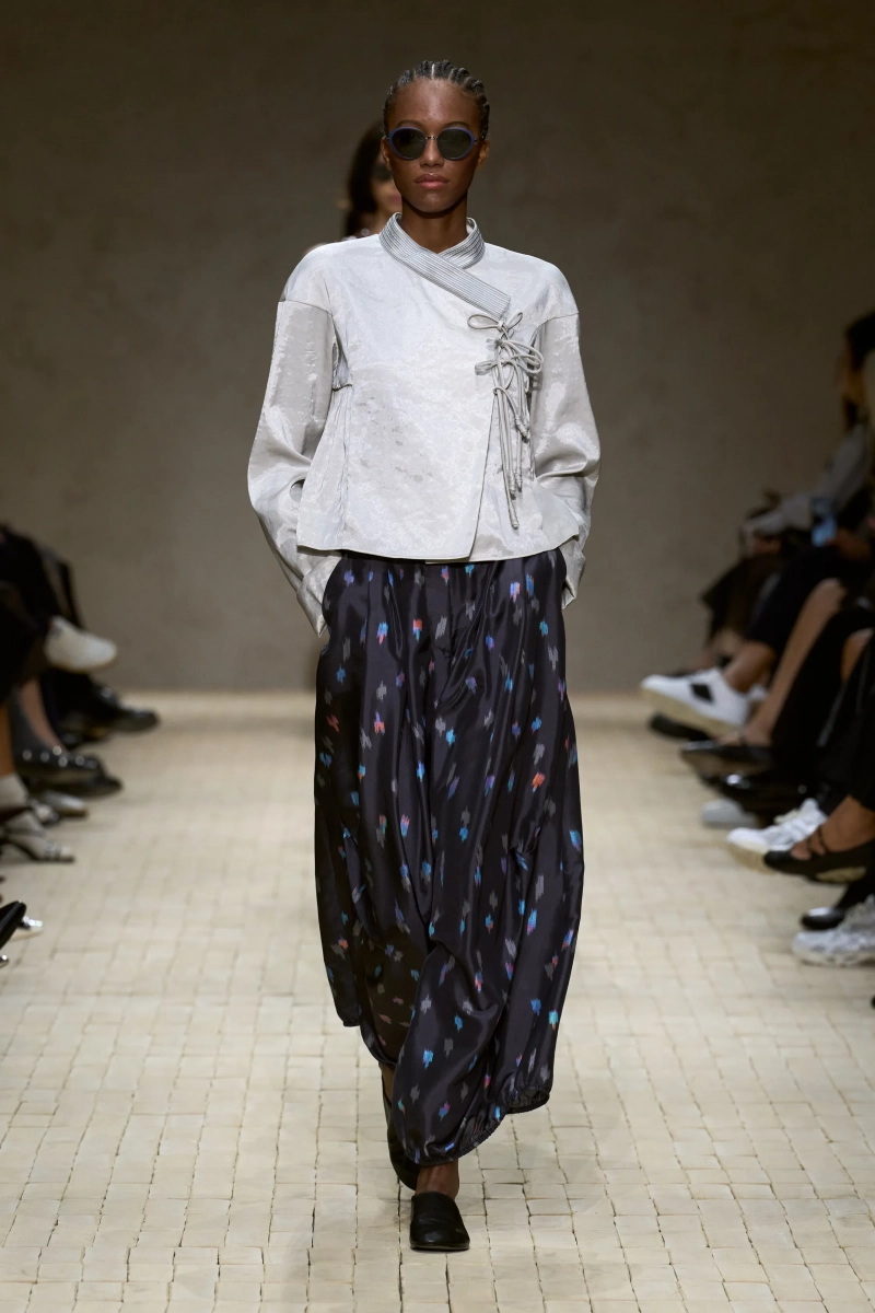 Затем появились сувениры из путешествий: шелка икат в развевающихся брюках и жакетах, клетчатый крой и блузы, воротники с отделкой «оби», корсеты с ремешками. Это были культурные отзвуки, переосмысленные через словарь Армани, напоминающие нам о том, как узоры путешествуют через границы, меняясь, но оставаясь знакомыми. Для вечера путешественник Emporio погружался в ностальгию по ночной жизни — черные комбинезоны с глубоким вырезом, сиреневые парашютные брюки из плотного нейлона, бра и топы, украшенные кристаллами. Воображаемый обратный билет в только что прожитые моменты.