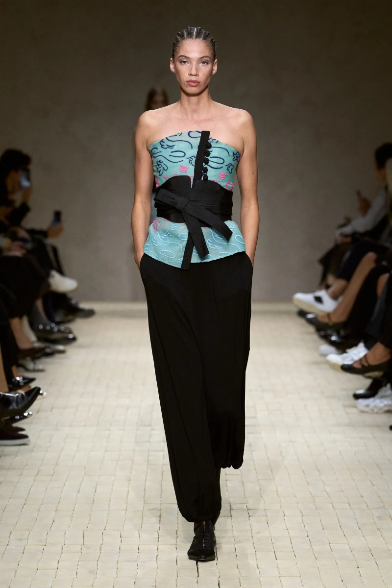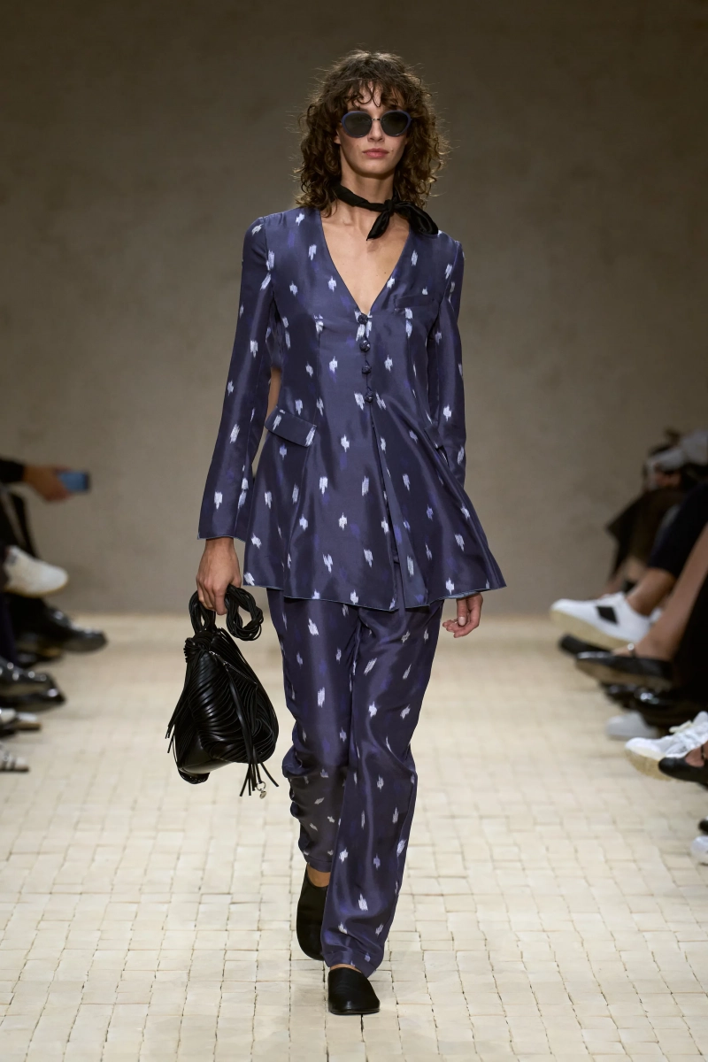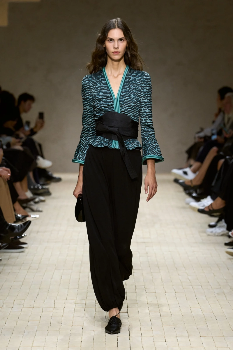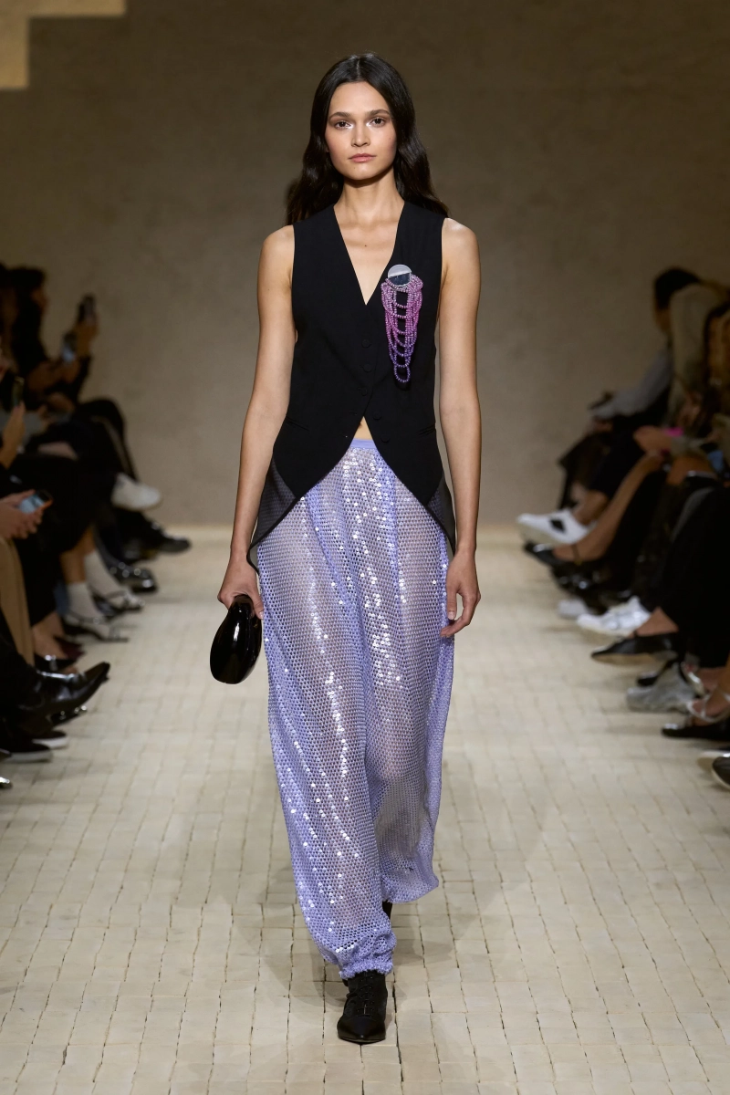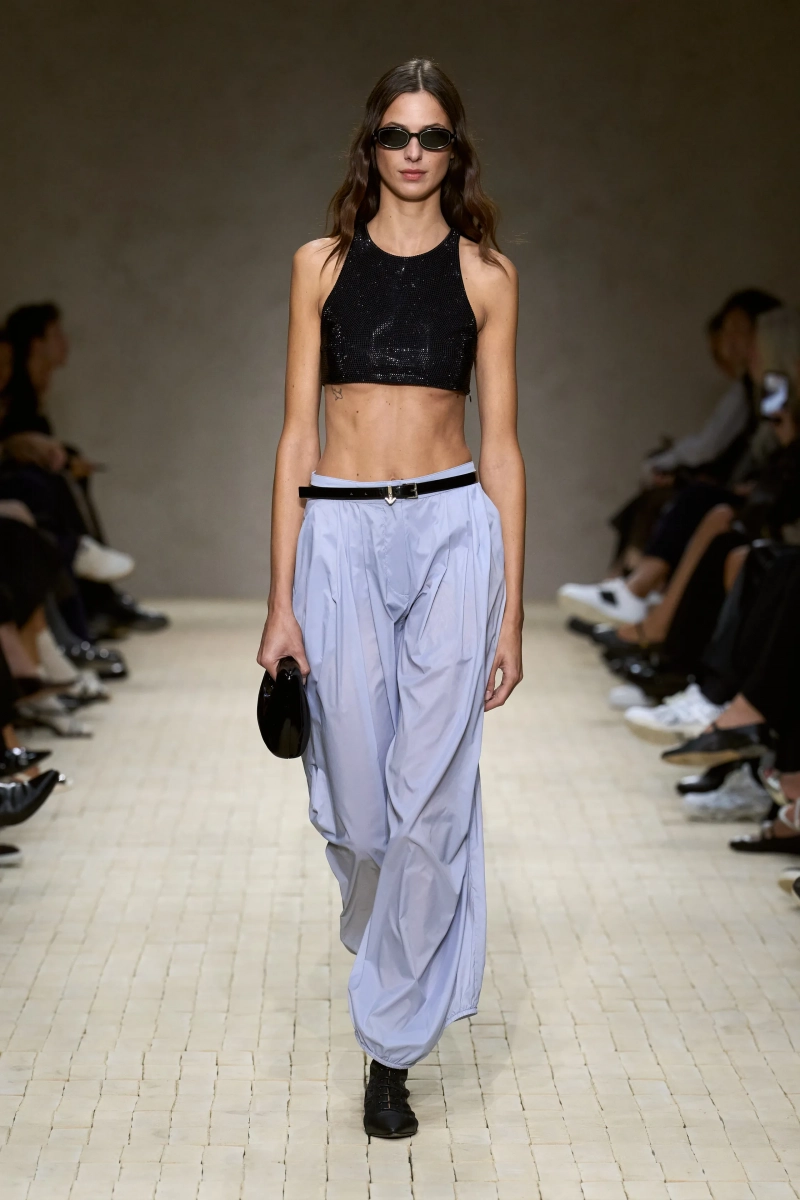 Затем появились сувениры из путешествий: шелка икат в развевающихся брюках и жакетах, клетчатый крой и блузы, воротники с отделкой «оби», корсеты с ремешками. Это были культурные отзвуки, переосмысленные через словарь Армани, напоминающие нам о том, как узоры путешествуют через границы, меняясь, но оставаясь знакомыми. Для вечера путешественник Emporio погружался в ностальгию по ночной жизни — черные комбинезоны с глубоким вырезом, сиреневые парашютные брюки из плотного нейлона, бра и топы, украшенные кристаллами. Воображаемый обратный билет в только что прожитые моменты.