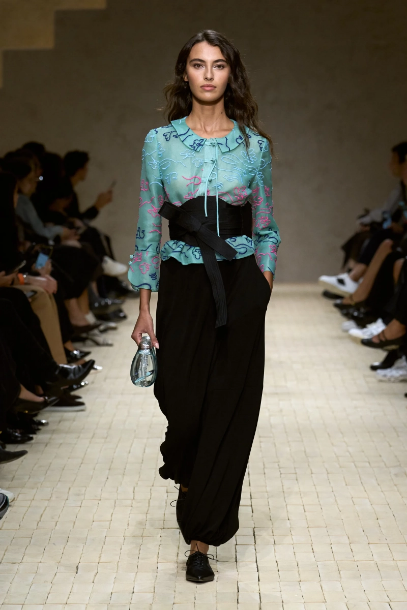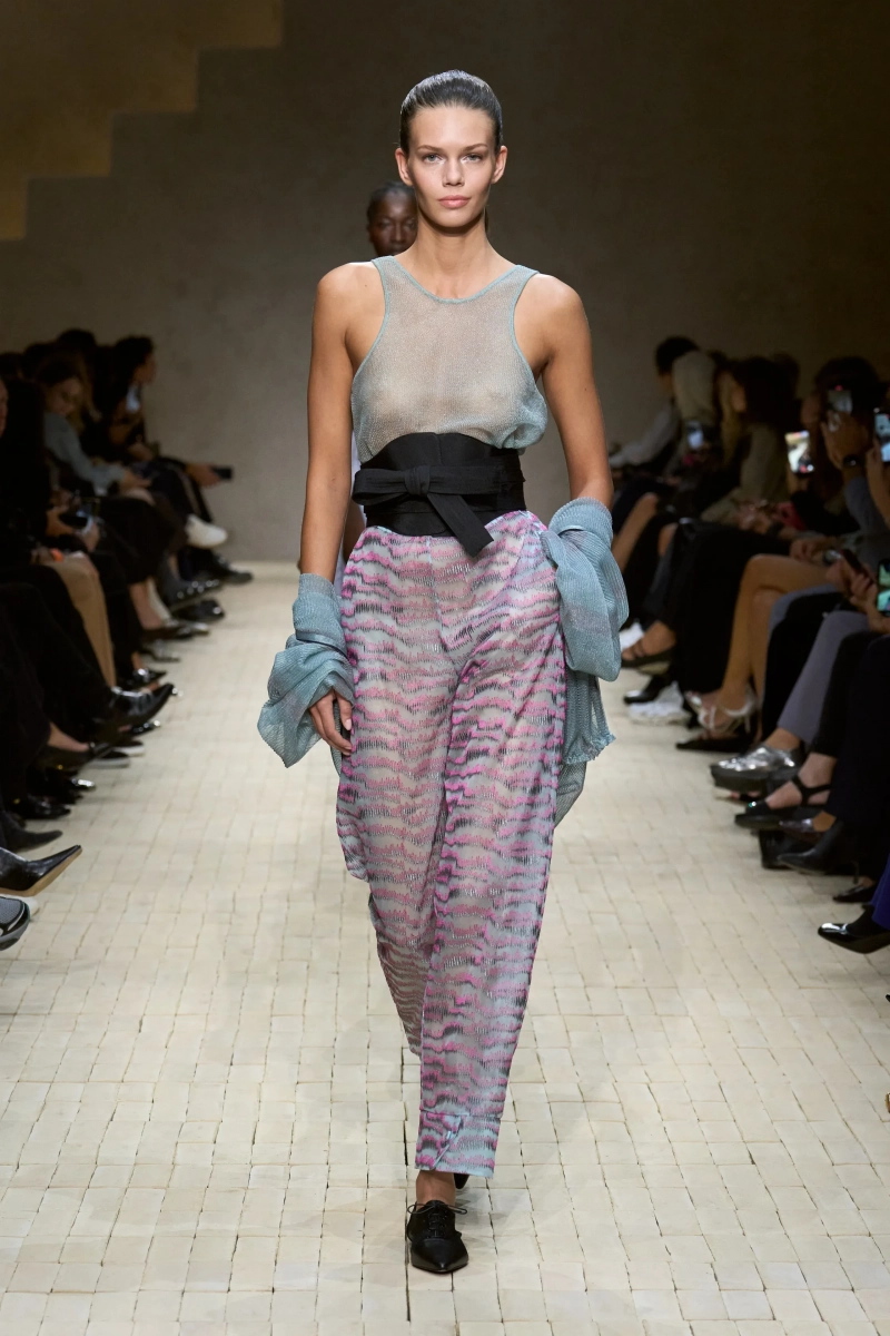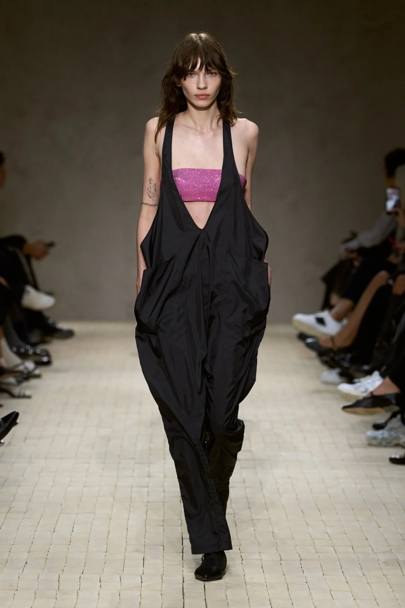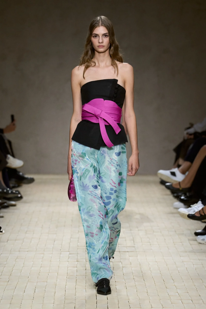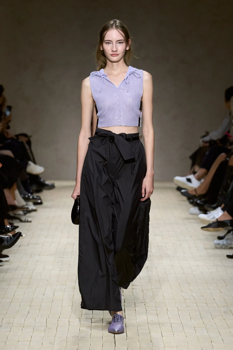 Затем появились сувениры из путешествий: шелка икат в развевающихся брюках и жакетах, клетчатый крой и блузы, воротники с отделкой «оби», корсеты с ремешками. Это были культурные отзвуки, переосмысленные через словарь Армани, напоминающие нам о том, как узоры путешествуют через границы, меняясь, но оставаясь знакомыми. Для вечера путешественник Emporio погружался в ностальгию по ночной жизни — черные комбинезоны с глубоким вырезом, сиреневые парашютные брюки из плотного нейлона, бра и топы, украшенные кристаллами. Воображаемый обратный билет в только что прожитые моменты.