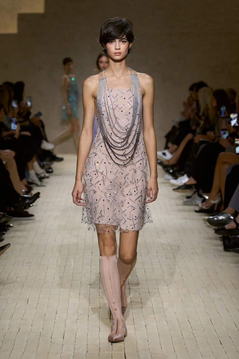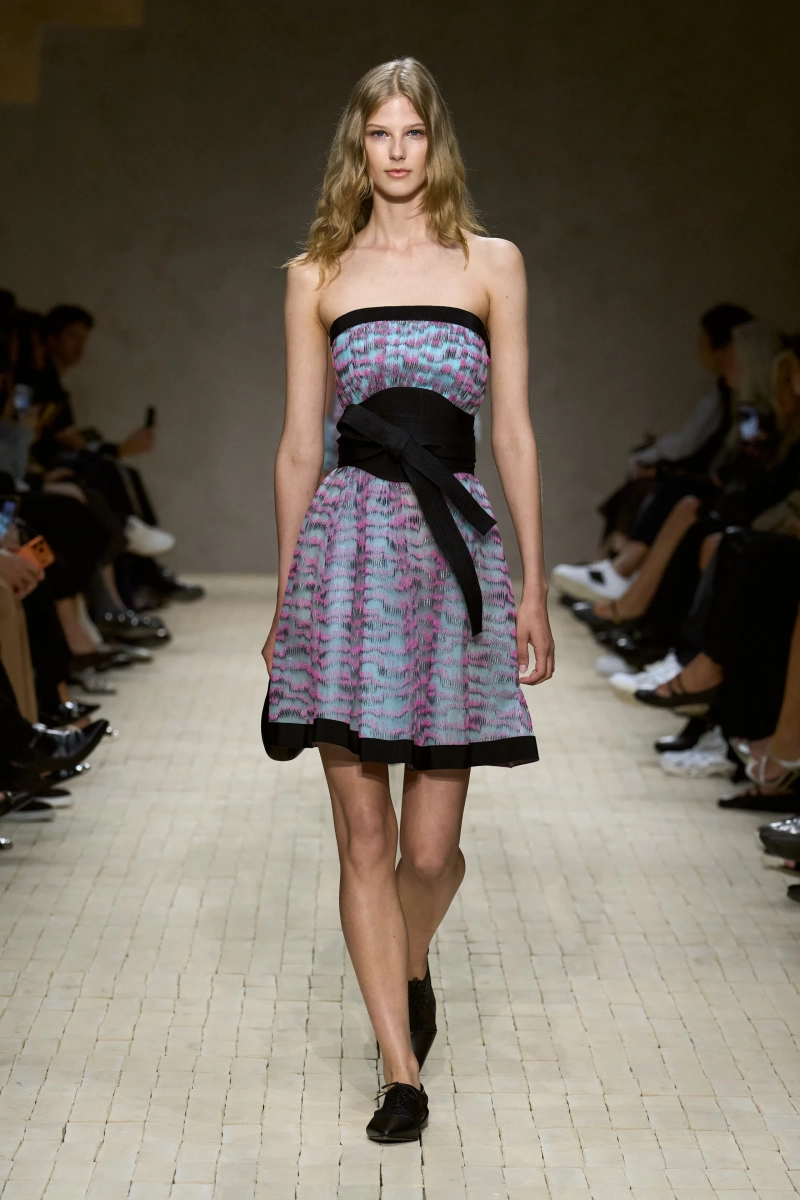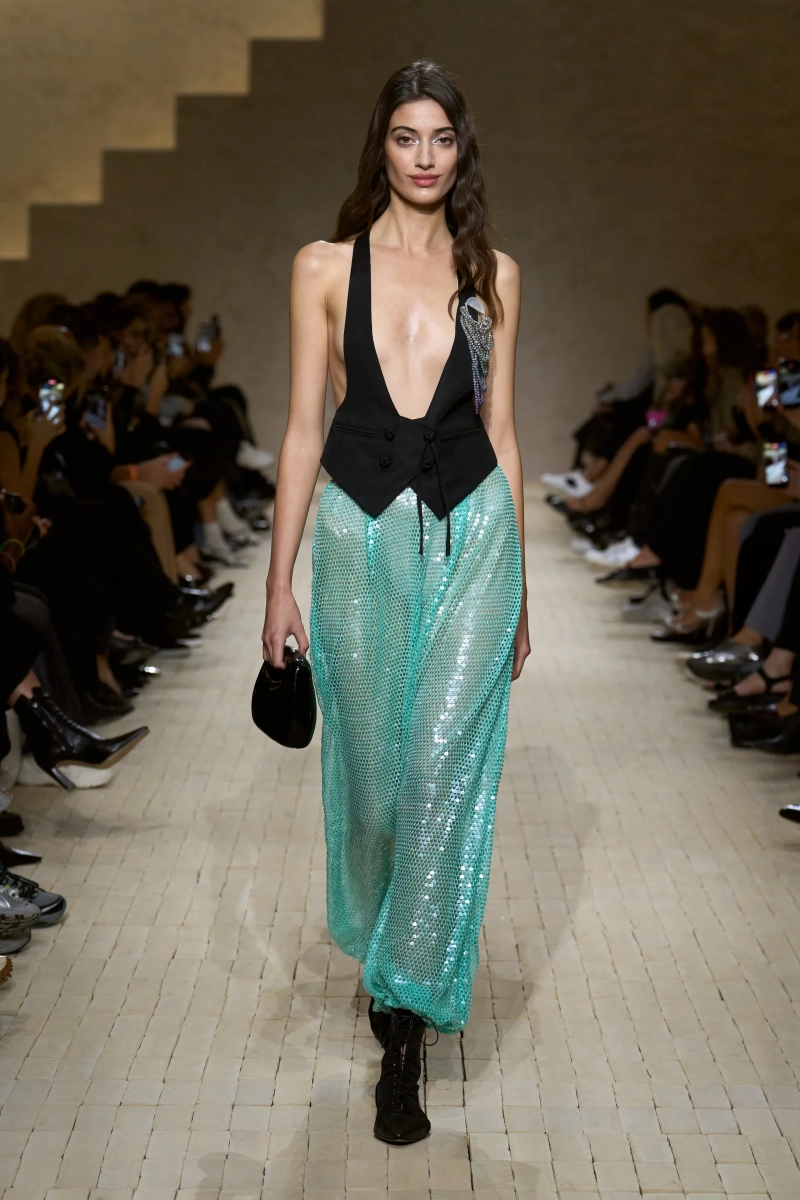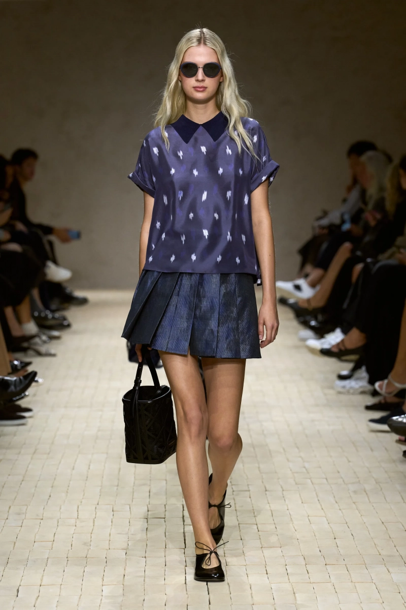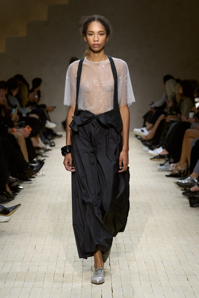 Затем появились сувениры из путешествий: шелка икат в развевающихся брюках и жакетах, клетчатый крой и блузы, воротники с отделкой «оби», корсеты с ремешками. Это были культурные отзвуки, переосмысленные через словарь Армани, напоминающие нам о том, как узоры путешествуют через границы, меняясь, но оставаясь знакомыми. Для вечера путешественник Emporio погружался в ностальгию по ночной жизни — черные комбинезоны с глубоким вырезом, сиреневые парашютные брюки из плотного нейлона, бра и топы, украшенные кристаллами. Воображаемый обратный билет в только что прожитые моменты.